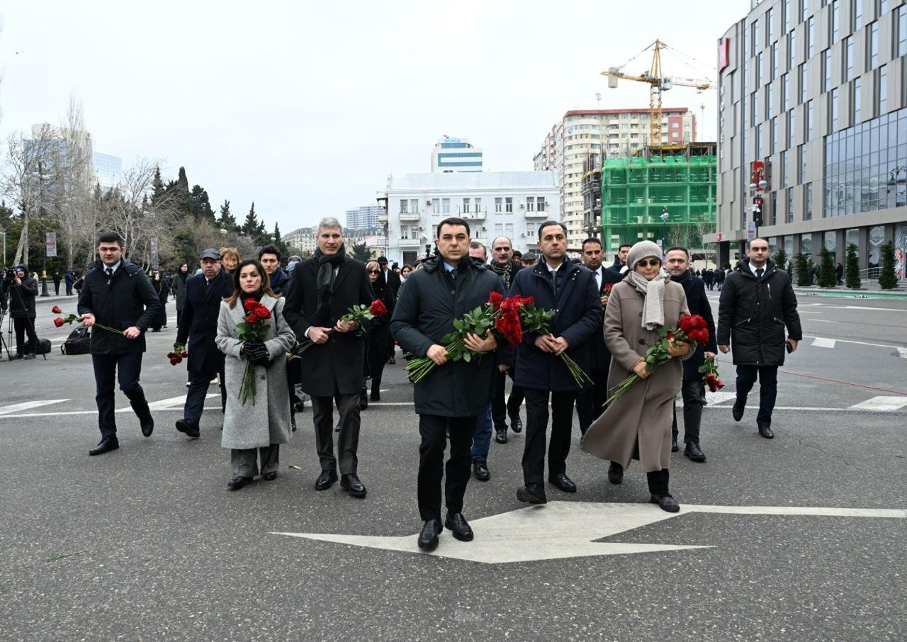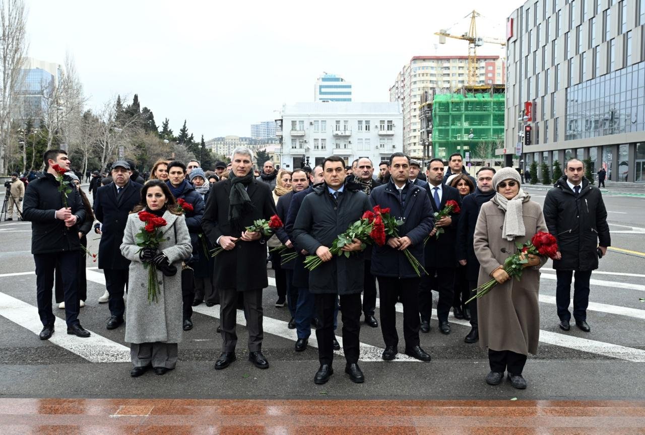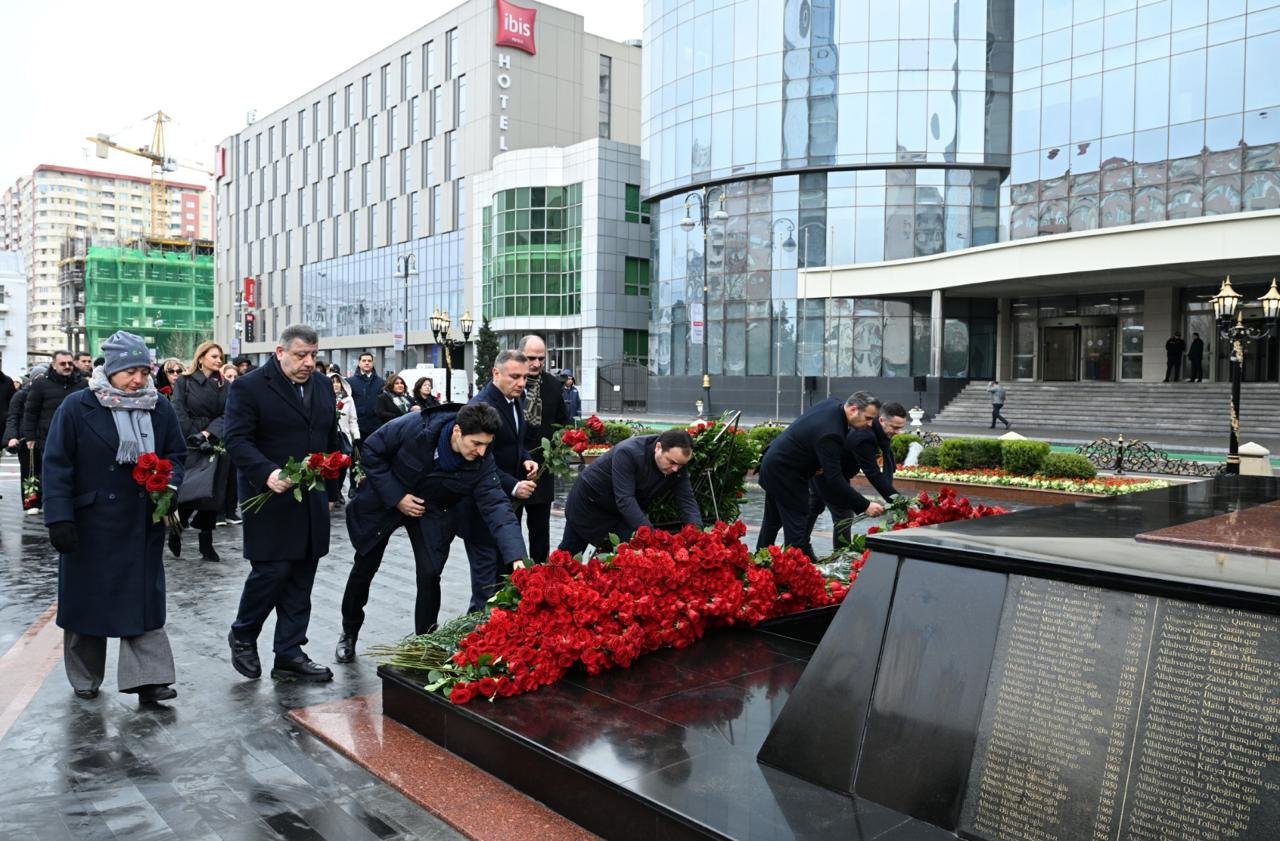 Abidənin önünə tər çiçəklər düzülüb, faciə qurbanlarının xatirəsinə ehtiram ifadə olunub.