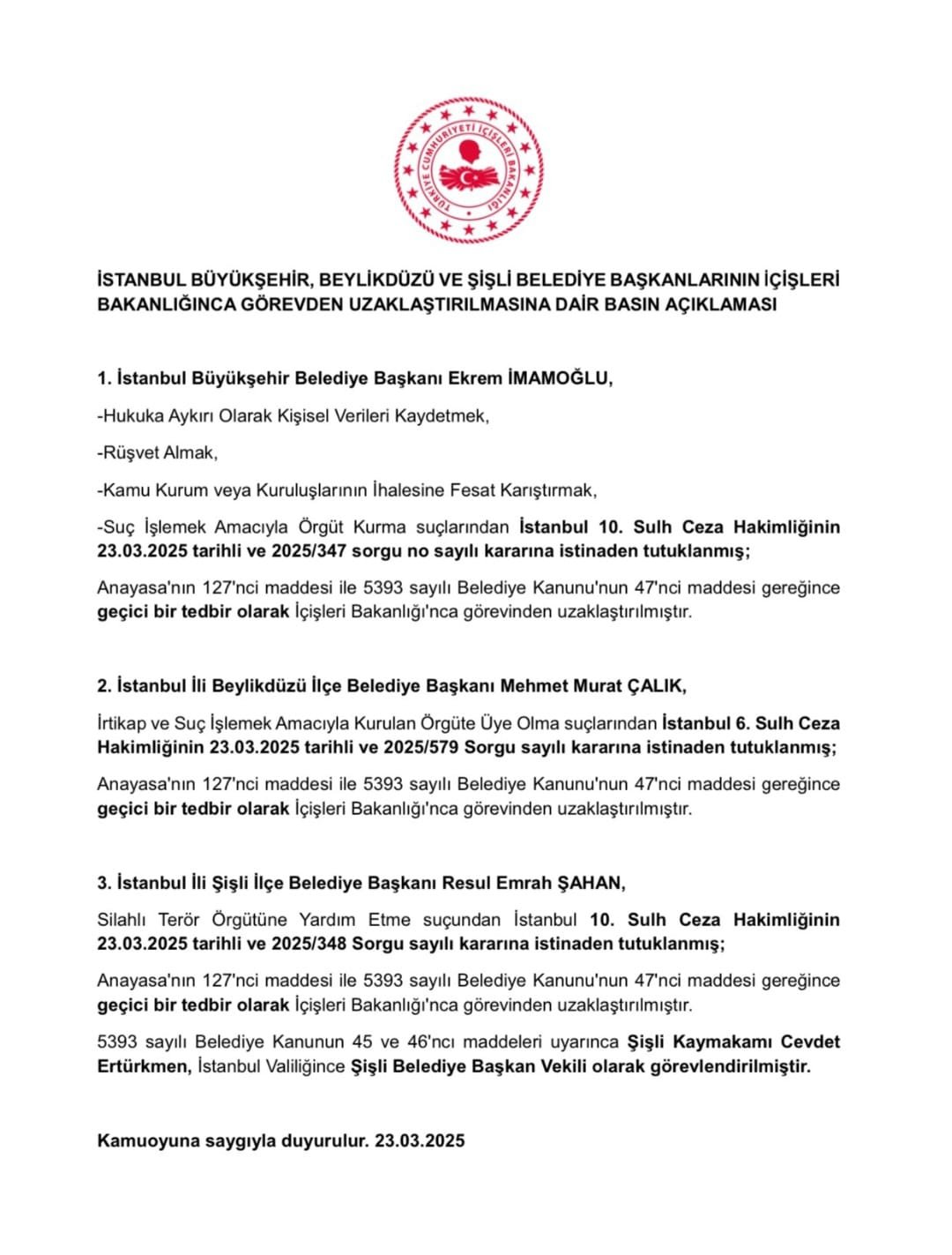 Məlumata görə, İmamoğlu ilə birlikdə həbs olunan Şişli bələdiyyə sədri Resul Emrah Şahan və Beylikdüzü bələdiyyə sədri Mehmet Murat Çalık da vəzifələrindən uzaqlaşdırılıblar.