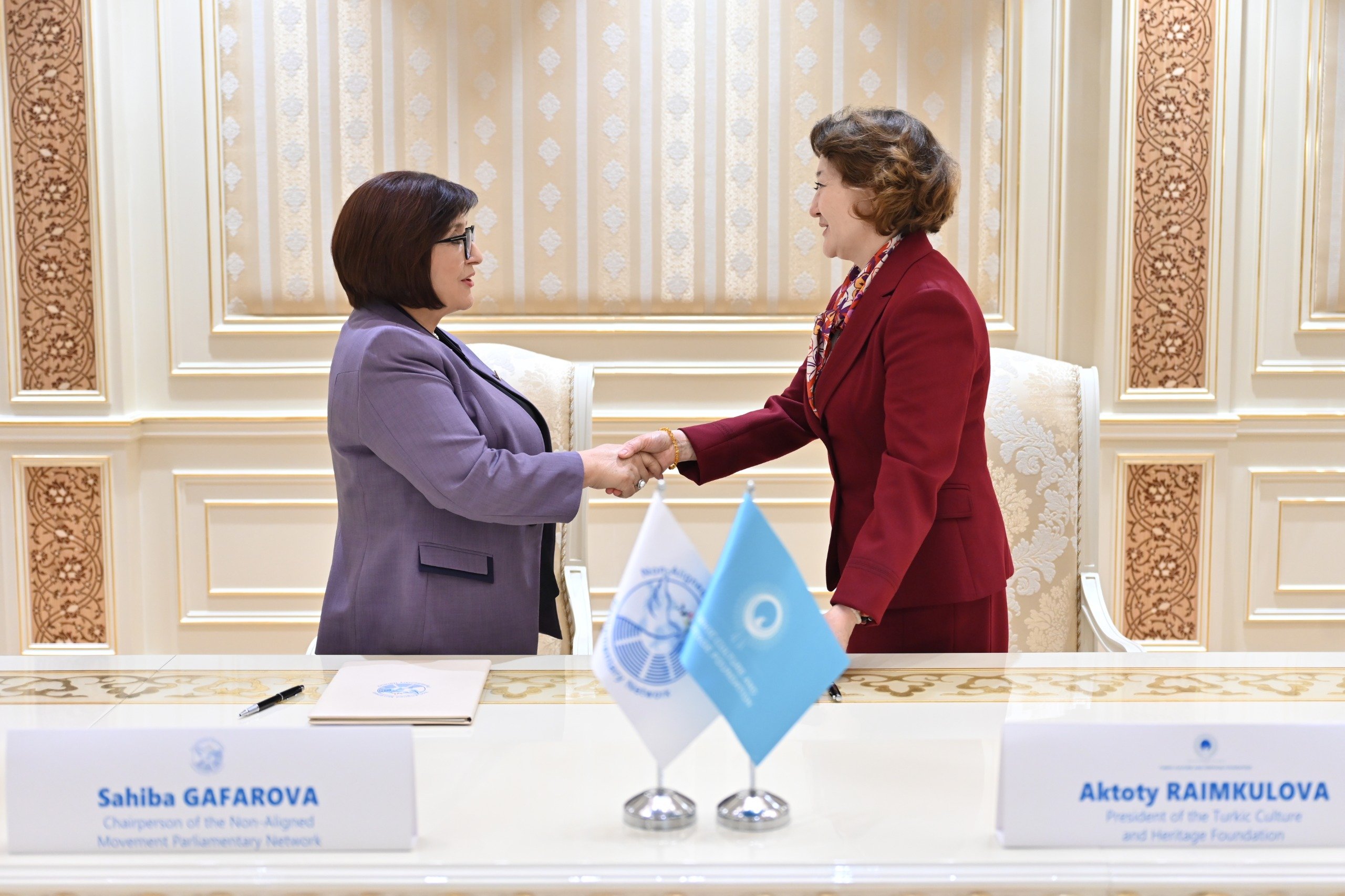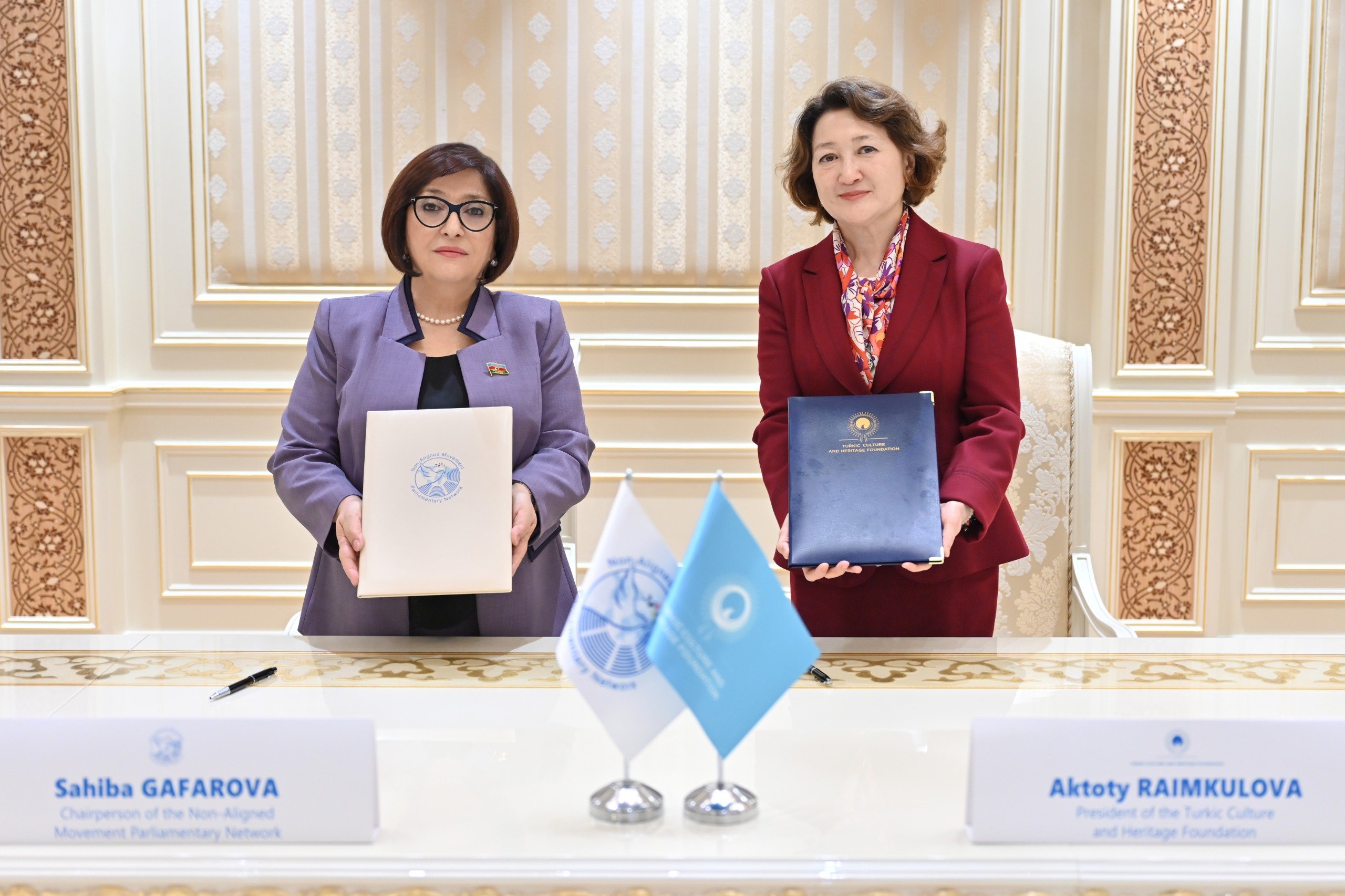 Sənədi Milli Məclisin spikeri, Qoşulmama Hərəkatı Parlament Şəbəkəsinin sədri Sahibə Qafarova və Türk Mədəniyyəti və İrsi Fondunun rəhbəri Aktoti Raimkulova imzalayıblar.