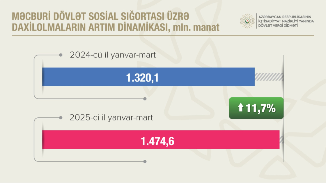 Cari ilin yanvar-mart aylarında muzdlu işçi sayının və əməkhaqqı fondunun “ağarması” şəraitində məcburi dövlət sosial sığorta haqları üzrə daxilolmalar 1 milyard 474,5 manatdan çox olub.