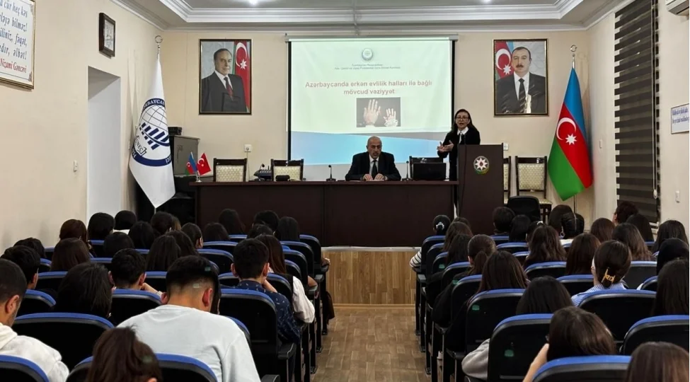 Ailə, Qadın və Uşaq Problemləri üzrə Dövlət Komitəsi tərəfindən Elm və Təhsil Nazirliyinin dəstəyi ilə təhsil müəssisələrində yeniyetmə və gənclərin müxtəlif mövzular ətrafında məlumatlandırılması istiqamətində görüşlərin davamı olaraq 10 aprel 2025-ci il tarixində Azərbaycan Dövlət İqtisad Universitetinin nəzdində Azərbaycan Maliyyə-İqtisad Kollecinin tələbələri ilə erkən evlilik və qohum evliliklərinin mənfi nəticələri mövzusundagörüş keçirilib.