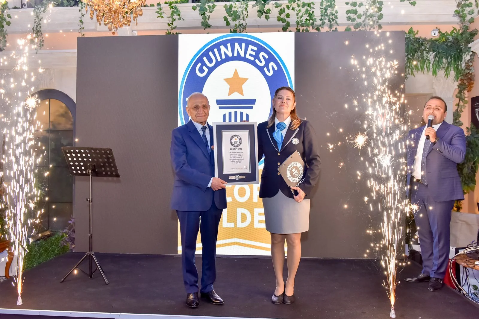 Mərasimdə yubilyar Faiq Həsənovun adının ən uzun müddətli hakim kimi Ginnesin Rekordlar Kitabına daxil edildiyi elan olunub. Çıxış edən “Guinness World Records”un rəsmisi Şeyda Subaşı təqdim olunan məlumatların yoxlanılaraq tələb edilən şərtlərə tam uyğun olduğunu söyləyib. Beləliklə Faiq Həsənov şahmat üzrə ən uzun müddətli kişi hakim kimi rəsmən təsdiqlənib. F.Həsənov 60 il 149 gün müxtəlif şahmat yarışlarında hakimlik etməklə dünyanın məşhur Ginnesin Rekordlar Kitabına düşüb. Bununla bağlı “Guinness World Records”un rəsmisi səbəbkara rəsmi sertifikatı təqdim edib.