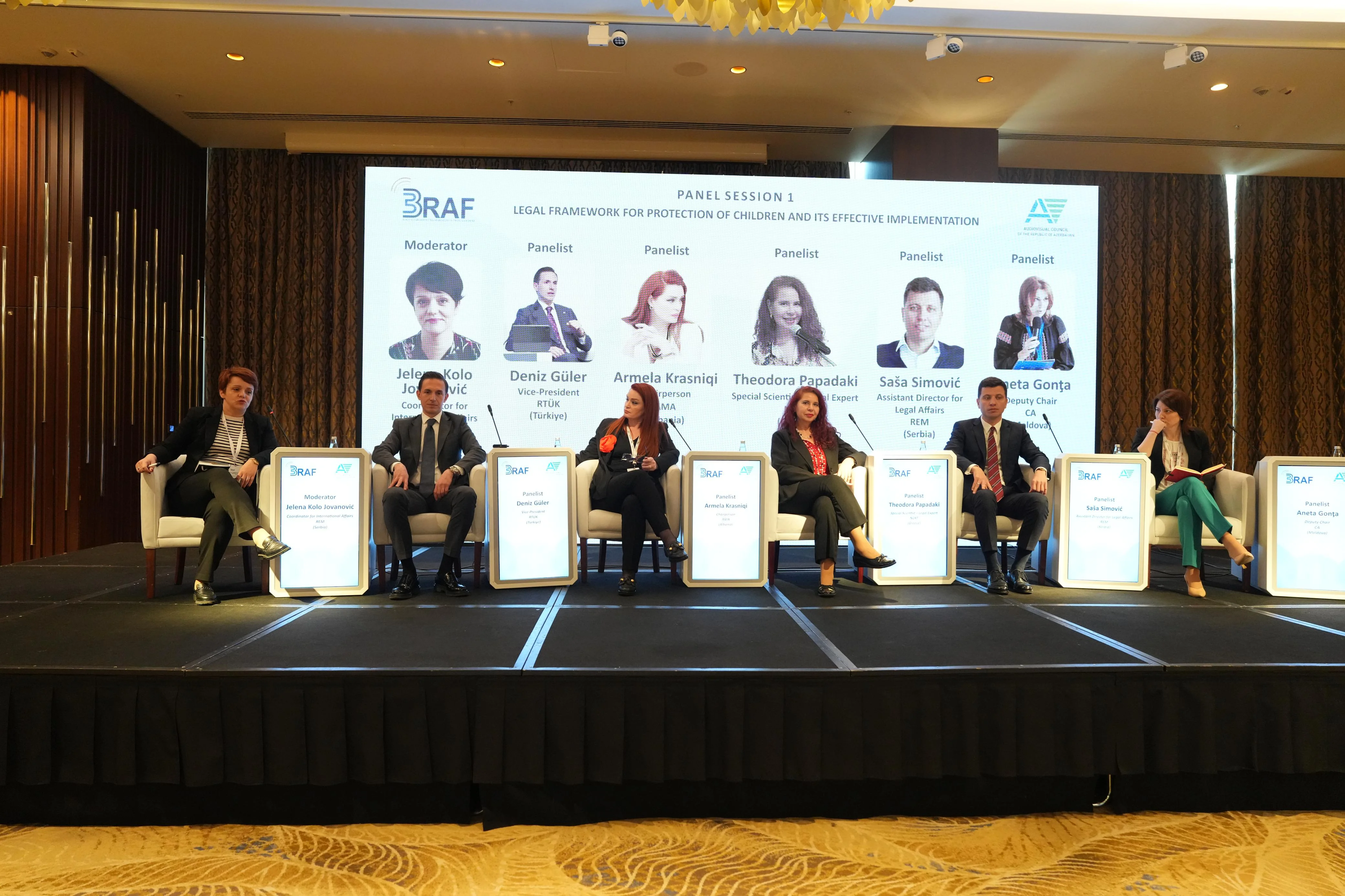 Birinci panel "Uşaqların müdafiəsi üçün hüquqi baza və bunun səmərəli tətbiqi" mövzusuna həsr olunmuşdur. Serbiya Respublikasının Audiovizual və Elektronik Media üzrə Tənzimləyici Qurumunun (REM) beynəlxalq məsələlər üzrə koordinatoru xanım Yelena Kolo Yovanoviçin moderatorluğu ilə baş tutan paneldə RTÜK-ün vitse-prezidenti Dəniz Gülər, Albaniya Audiovizual Media Qurumunun (AMA) sədri xanım Armela Krasniqi, Yunanıstanın Radio və Televiziya üzrə Milli Şurasının (NCRT) hüquqi məsələlər üzrə eksperti xanım Teodora Papadaki, Serbiya Respublikasının Audiovizual və Elektronik Media üzrə Tənzimləyici Qurumunun (REM) hüquqi məsələlər üzrə direktor müavini Saşa Simoviç və Moldova Respublikasının Audiovizual Şurasının (CA) sədr müavini xanım Aneta Gonta tərəfindən uşaqların müdafiəsi üçün hüquqi baza ilə bağlı müzakirələr aparılmışdır.