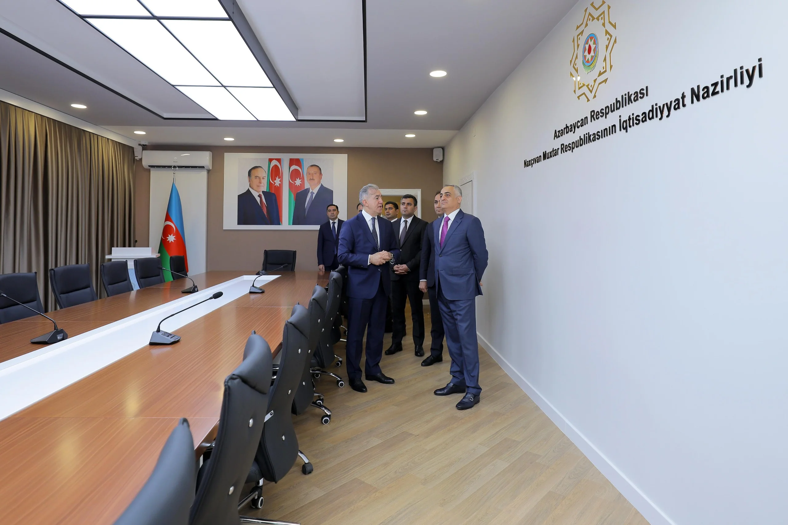 Nazirliyin binasında yeni yaradılmış şəraitlə tanışlıq olub. Məlumat verilib ki, foyedə Heydər Əliyev guşəsi yaradılıb, giriş və çıxışlara operativ nəzarət edilməsi məqsədilə turniket sistemləri quraşdırılıb. Həmçinin müasir standartlara cavab verən iclas zalı, vətəndaşların qəbulu otağı qurulub, iş otaqları müasir ofis mebelləri və avadanlıqlarla təchiz edilib. İclas zalında quraşdırılan interaktiv monitor görüş və tədbirlərin daha effektiv keçirilməsini təmin edir. Nazirliyin vətəndaşların qəbulu otağında daha yüksək xidmət keyfiyyəti və təhlükəsizlik standartlarının təmin edilməsi məqsədilə səsyazan kamera və monitor quraşdırılıb.