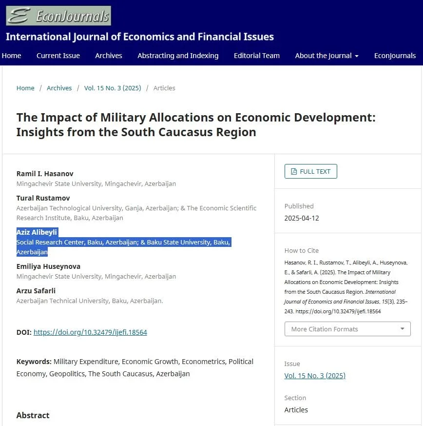 Sosial Tədqiqatlar Mərkəzininin Media və Kommunikasiya Departamentinin rəhbəri, AMEA Fəlsəfə və Sosiologiya İnstitutunun Siyasətin fəlsəfəsi və sosiologiyası şöbəsinin dissertantı, BDU-nun Beynəlxalq Jurnalistika fakültəsinin müəllimi Ə𝐳𝐢𝐳 Ə𝐥𝐢𝐲𝐞𝐯𝐢𝐧 həmmüəllif olduğu "The Impact of Military Allocations on Economic Development: Insights from the South Caucasus Region" adlı məqalə 𝐒𝐜𝐨𝐩𝐮𝐬 𝐢𝐧𝐝𝐞𝐤𝐬𝐥𝐢 "International Journal of Economics and Financial Issues" jurnalında dərc edilib.
