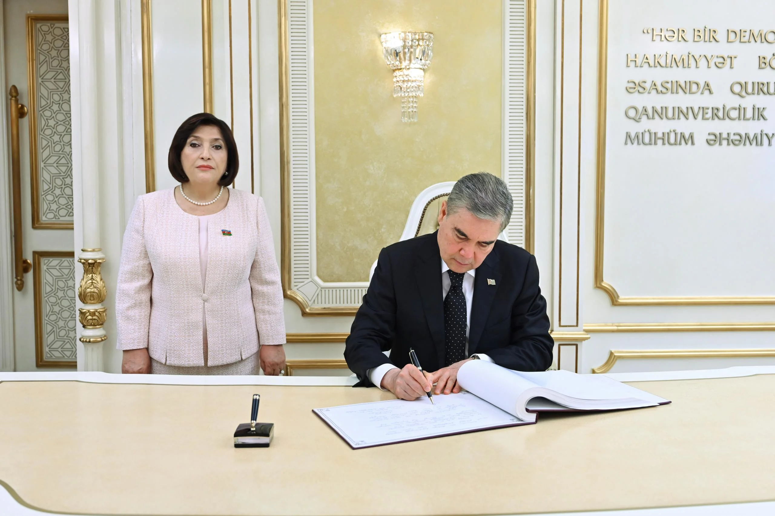 Xalq Məsləhətinin sədri əvvəlcə Milli Məclisin plenar iclas zalı ilə tanış olub. Ulu Öndər Heydər Əliyevin adını daşıyan xatirə zalına gələn qonaqlar burada Azərbaycan xalqının Ümummilli Lideri Heydər Əliyevin həyatının və siyasi fəaliyyətinin müxtəlif dövrlərini əks etdirən eksponatlara baxıblar. Türkmənistan Xalq Məsləhətinin sədri Qurbanqulu Berdiməhəmmədov buradakı Xatirə kitabına ürək sözlərini yazıb.
