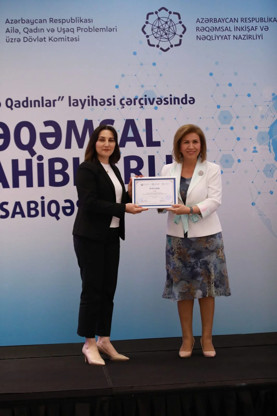 24 iyul 2025-ci il tarixində Ailə, Qadın və Uşaq Problemləri üzrə Dövlət Komitəsinin təşkilatçılığı, Rəqəmsal İnkişaf və Nəqliyyat Nazirliyi, İnnovasiya və Rəqəmsal İnkişaf Agentliyinin tərəfdaşlığı ilə “İKT-də Qadınlar” layihəsi çərçivəsində “Rəqəmsal Sahibkarlıq” müsabiqəsi qaliblərinin mükafatlandırma mərasimi keçirilib.