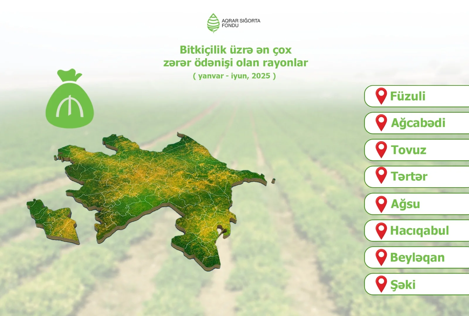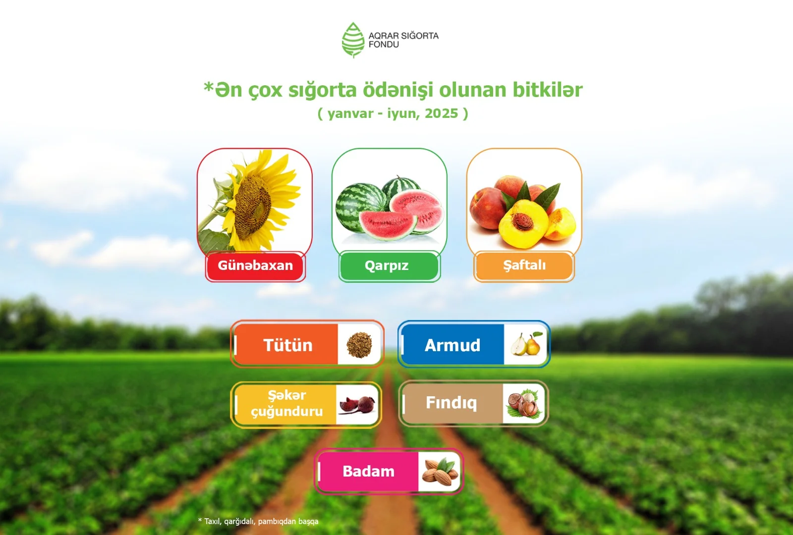 Hesabat dövründə taxıl, qarğıdalı və pambıq sahələrindən sonra ən çox sığorta ödənişi edilən bitkilər günəbaxan, tütün, armud, şaftalı, şəkər çuğunduru, fındıq, badam və qarpız olub. Bu ilin ilk 6 ayı ərzində ən çox zərər ödənişi həyata keçirilən rayonlar isə Füzuli, Ağcabədi, Tovuz, Tərtər, Ağsu, Hacıqabul, Beyləqan və Şəkidir.