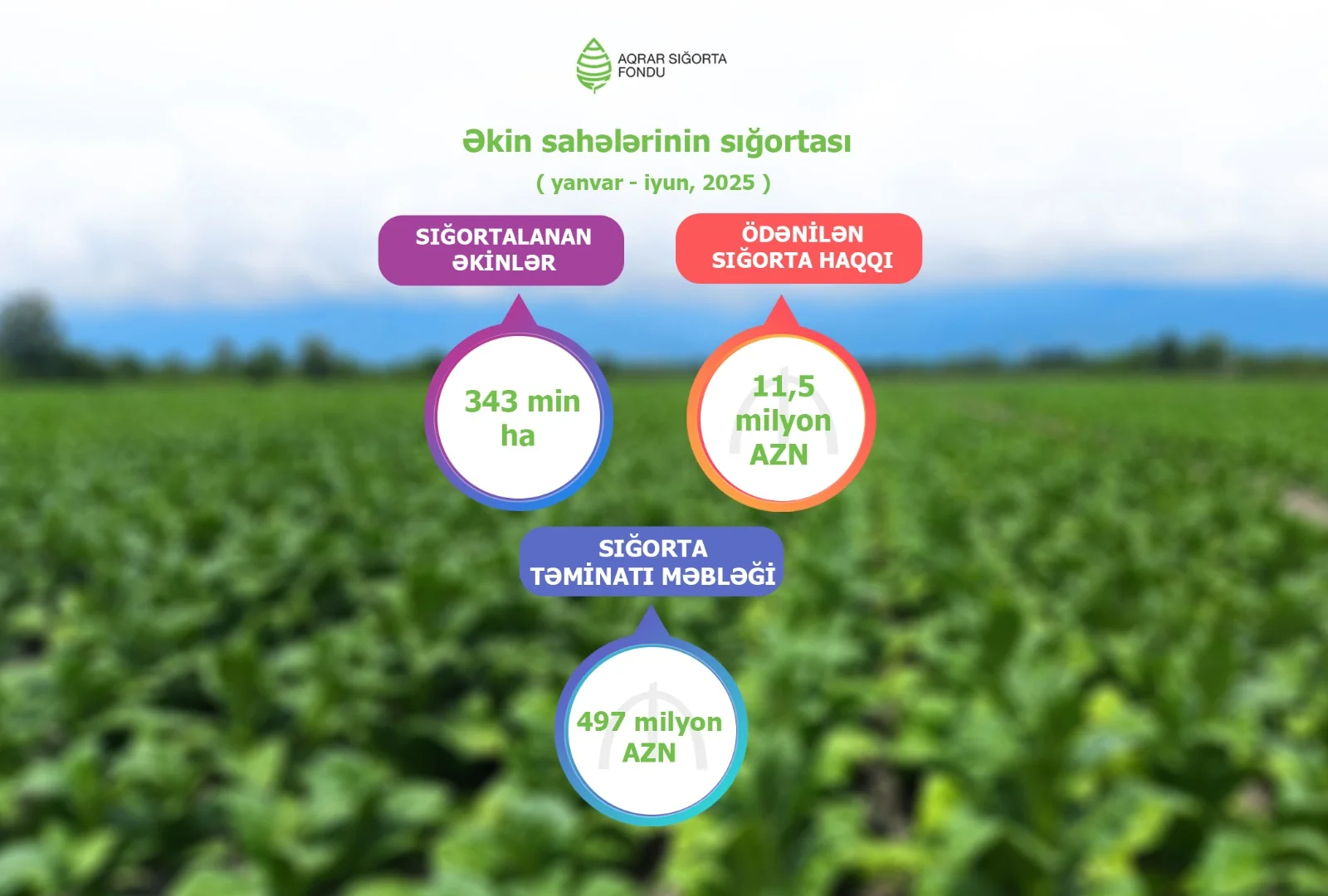 2025-ci ilin yanvar-iyun aylarında Aqrar Sığorta Fondu tərəfindən 342,6 min hektar əkin sahəsi sığorta edilib. Bu sahələr üzrə ödənilən sığorta haqqı 11 milyon 475 min manat, təminat verilmiş sığorta məbləği isə 497 milyon manat təşkil edib. Bu il eyni zamanda ölkəmizdə ilk dəfə olaraq çiyələk sahələrinin sığortası həyata keçirilib.
