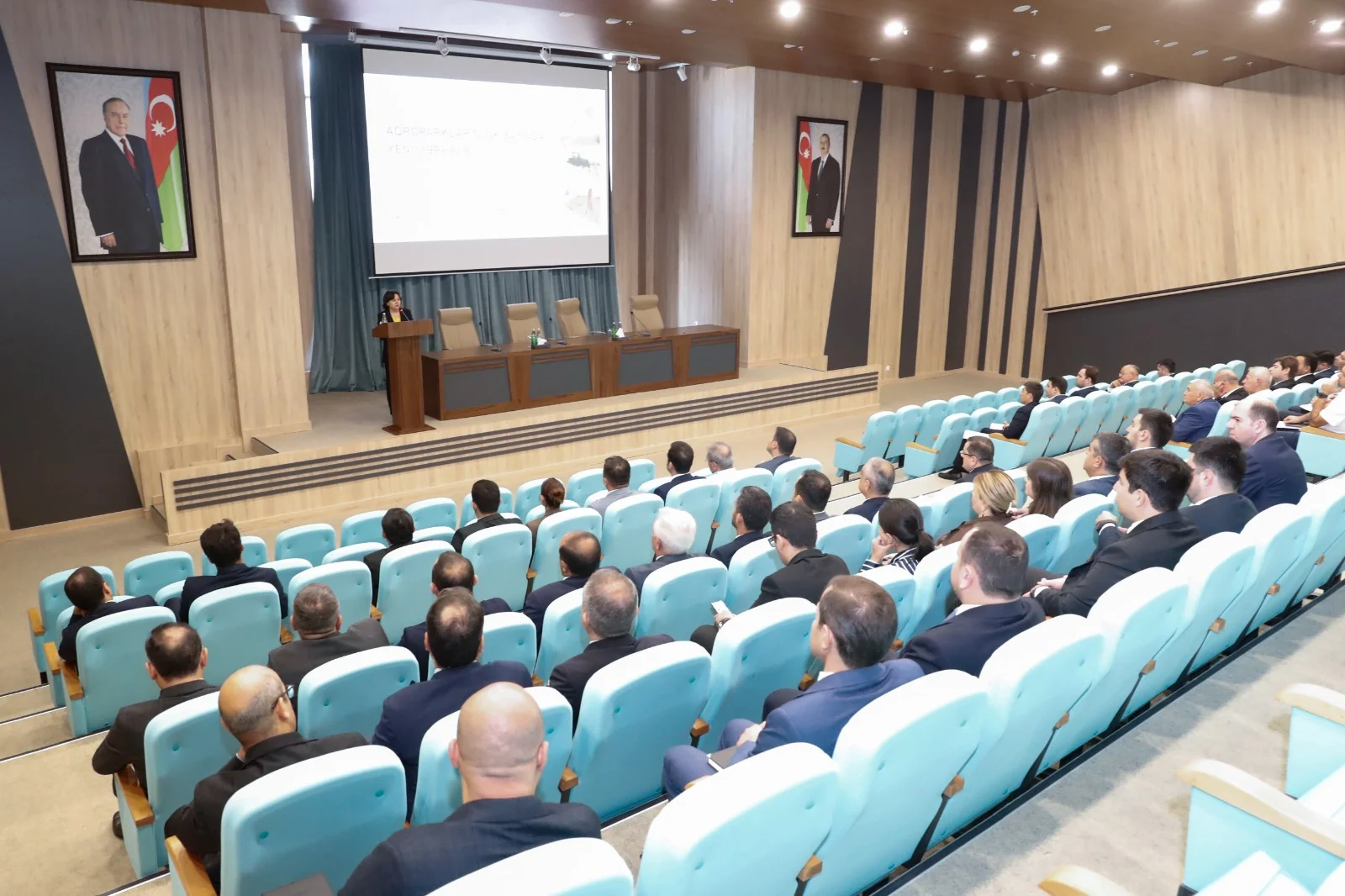 Nazirliyinin Azad olunmuş ərazilərlə və aqroparklarla iş şöbəsinin müdiri İlqar Məhərrəmov “Aqroparklarla bağlı dövlət siyasətinin əsas istiqamətləri, gələcəyə baxış” mövzusunda təqdimatla çıxış edib. Aqroparkların fəaliyyətinin hüquqi bazası və inkişaf perspektivləri barədə iştirakçıları məlumatlandıran İlqar Məhərrəmov bildirib ki, aqrar sahədə iri istehsal və emal subyektlərinin yaradılmasında əsas məqsədlər innovativ texnologiya və üsullar əsasında rəqabətyönümlü kənd təsərrüfatı məhsullarının istehsalını artırmaq, qeyri-neft sektorunun davamlı inkişafının təmin etmək, aqrar sənaye istehsalı sahəsində məşğulluq səviyyəsini yüksəltməkdir. Ölkəmizdə aqroparkların fəaliyyətinin əsas prioritet istiqamətlərinin birillik əkinlər, tərəvəzçilik, toxumçuluq və tingçilik, örtülü sahələrdə innovativ üsullarla bitkiçilik, heyvandarlıq, quşçuluq və balıqyetişdirmə, kənd təsərrüfatı məhsullarının emalı, çeşidlənməsi və qablaşdırılması olduğunu qeyd edən şöbə müdiri bu fəaliyyətlərin genişləndirilməsi üçün görülən stimullaşdırıcı tədbirlər barədə iştirakçıları məlumatlandırıb.