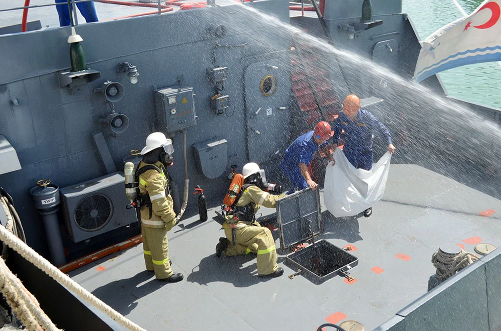 Təlimlərdə həmçinin gəminin dayanacaqda yanğına qarşı hazırlıq vəziyyəti, yaralılara ilkin tibbi yardımın göstərilməsi və onların ərazidən təxliyə olunması qaydaları praktiki olaraq məşq etdirilib. Qəza partiyasının davamlılıq uğrunda mübarizə fəaliyyəti, eləcə də gəmidə baş verə biləcək yanğınların növünə və yerinə uyğun tətbiq ediləcək mübarizə üsulları yerində göstərilərək yoxlanılıb.