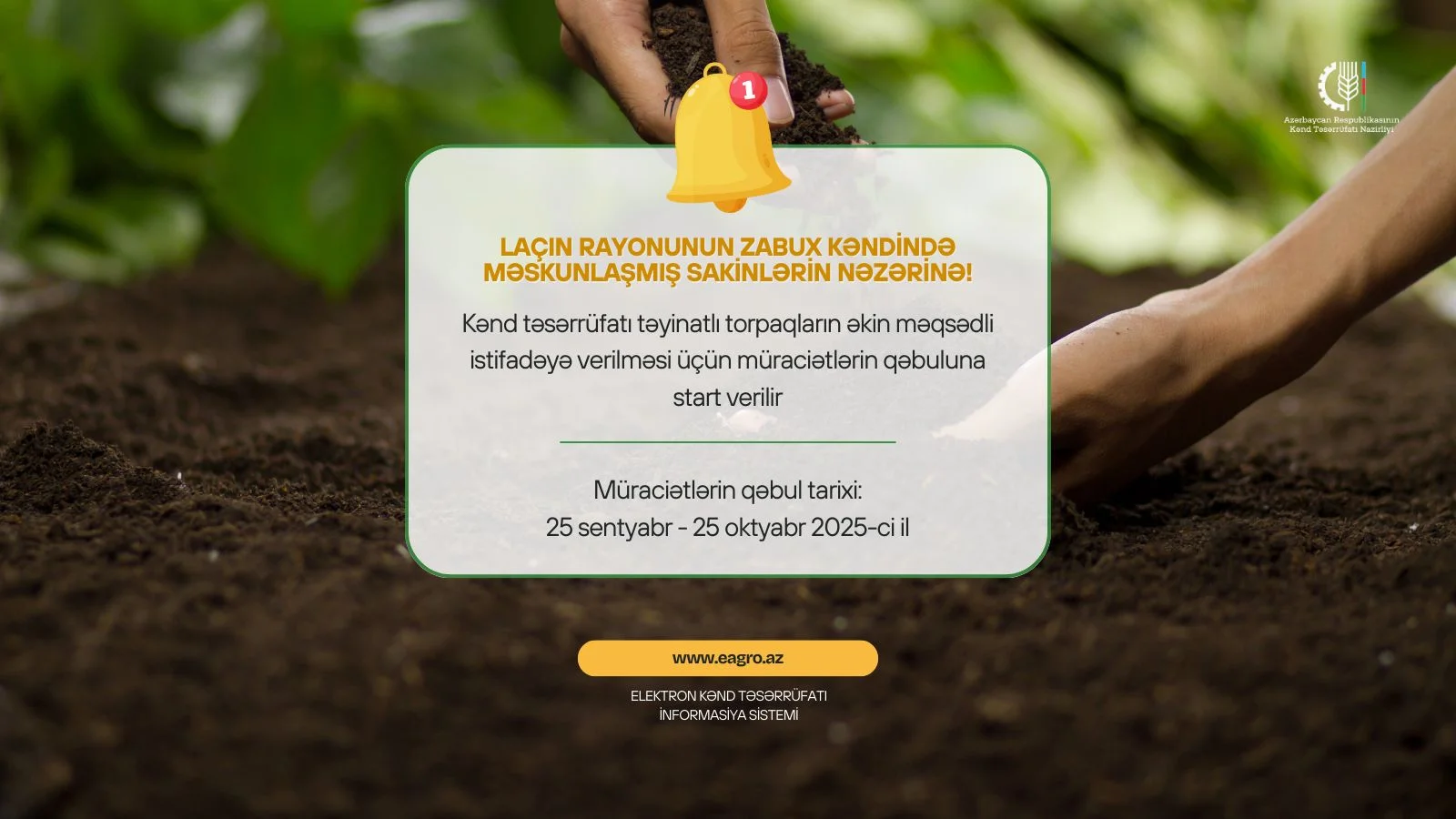 Sentyabrın 25-dən başlayaraq Laçın rayonunun Zabux kəndi üzrə kənd təsərrüfatı təyinatlı torpaqların əkin məqsədli istifadəyə verilməsi üçün Elektron Kənd Təsərrüfatı İnformasiya Sistemi (EKTİS) - eagro.az saytı vasitəsi ilə müraciətlərin qəbuluna başlanılır. Zabux kəndində məskunlaşan və yaşayan sakinlərdən müraciətlərin qəbulu prosesi oktyabrın 25-i günün sonunadək davam edəcək.