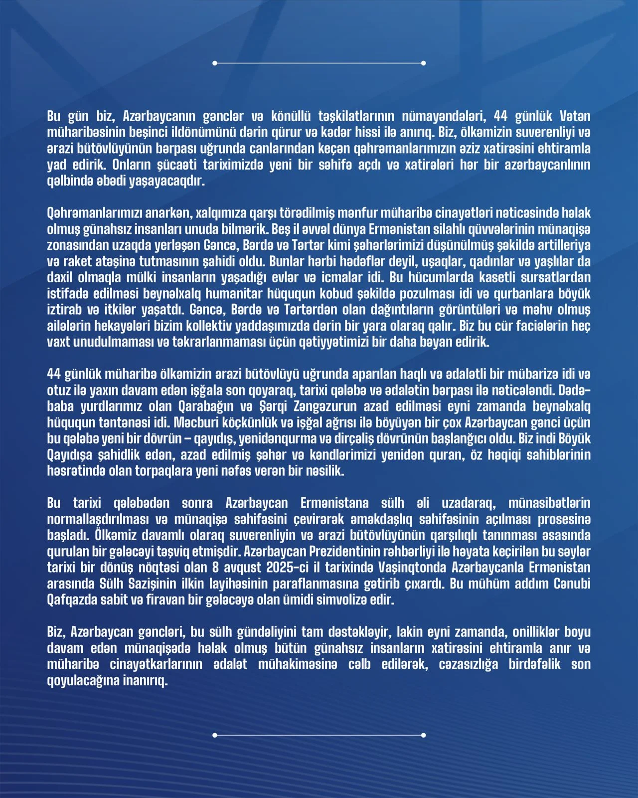 “Biz, Azərbaycan gəncləri, bu sülh gündəliyini tam dəstəkləyir, lakin eyni zamanda, onilliklər boyu davam edən münaqişədə həlak olmuş bütün günahsız insanların xatirəsini ehtiramla anır və müharibə cinayətkarlarının ədalət mühakiməsinə cəlb edilərək, cəzasızlığa birdəfəlik son qoyulacağına inanırıq,” – deyə bəyanatda vurğulanır.