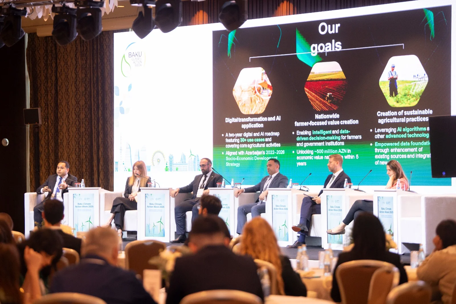 Panel sessiyada çıxış edən Kənd Təsərrüfatı Nazirliyində süni intellekt layihəsinin rəhbəri Surxay Novruzov, AİB-in Azərbaycan və Türkmənistan üzrə əməliyyat rəhbəri Marina Rose Best, “Azercosmos” CİS Mərkəzinin direktoru İsmət Baxışov və Aqrar İnnovasiya Mərkəzinin direktoru Anar Cəfərov iqlimə uyğun kənd təsərrüfatı təcrübələri, ağıllı suvarma, suya qənaət edən əkinçilik və torpağın qorunması üsulları, qida tullantılarının azaldılması və yerli qida sistemlərinin təşviqi, real vaxt rejimində məhsuldarlığın monitorinqi üçün rəqəmsal alətlər, yerli təchizat zəncirlərinin və icma əsaslı kənd təsərrüfatının gücləndirilməsi, davamlı kənd transformasiyasının dəstəklənməsində siyasət və maliyyənin rolu, həmçinin davamlı əkinçilikdə texnologiyanın rolu barədə fikirlərini bölüşüb, iştirakçıların suallarını cavablandırıblar.