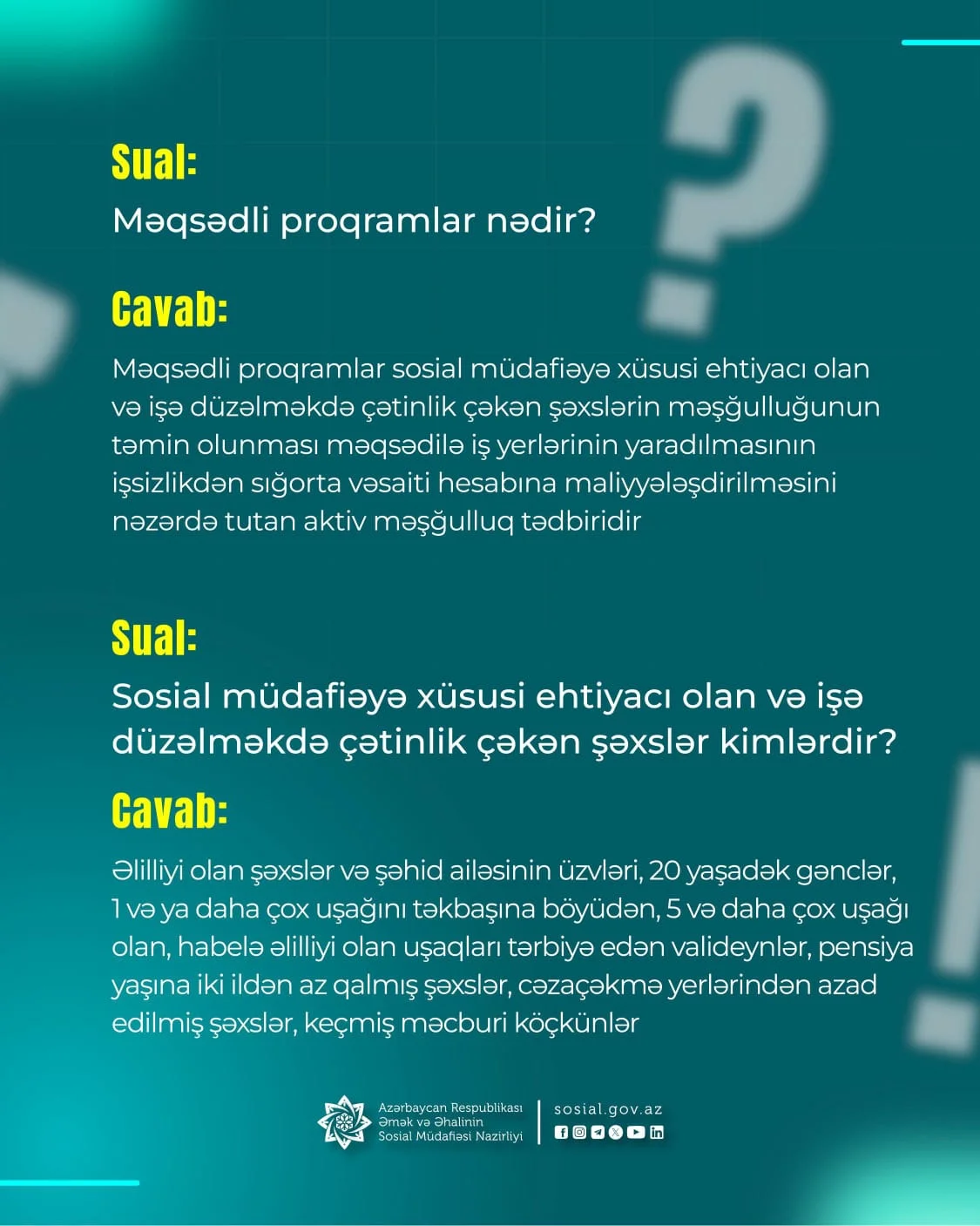 Sosial müdafiəyə xüsusi ehtiyacı olan və işə düzəlməkdə çətinlik çəkən şəxslər kateqoriyasına əlilliyi olan şəxslər, şəhid ailəsinin üzvləri, 20 yaşadək gənclər, 1 və ya daha çox uşağını təkbaşına böyüdən, 5 və daha artıq uşağı olan, habelə əlilliyi olan uşaqları tərbiyə edən valideynlər, pensiya yaşına iki ildən az qalmış şəxslər, cəzaçəkmə yerlərindən azad edilmiş şəxslər, keçmiş məcburi köçkünlər daxildir.