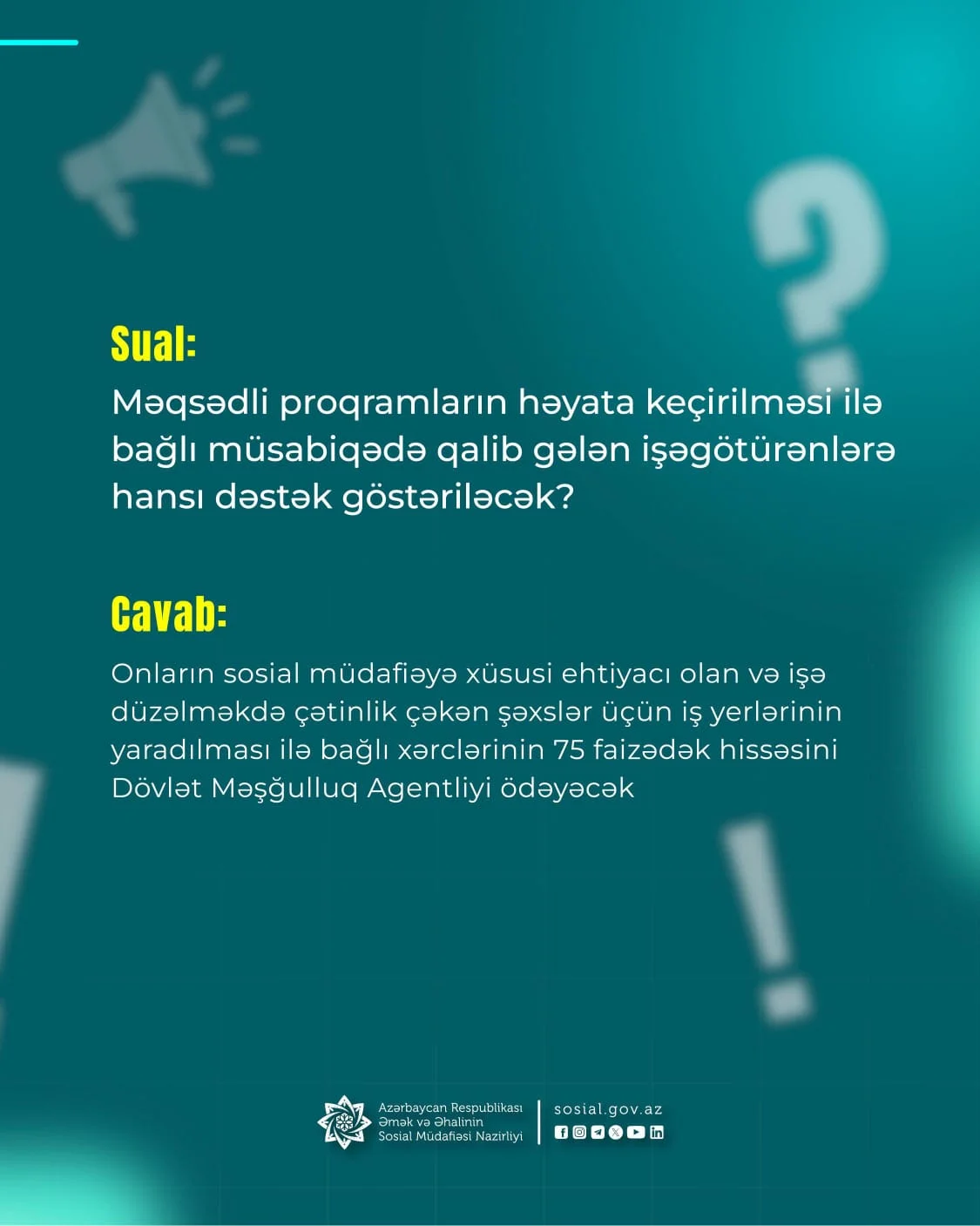 Müsabiqədə qalib gələn işəgötürənlərin sosial müdafiəyə xüsusi ehtiyacı olan və işə düzəlməkdə çətinlik çəkən şəxslər üçün iş yerlərinin yaradılması ilə bağlı xərclərinin 75 faizədək hissəsini Dövlət Məşğulluq Agentliyi ödəyəcək.