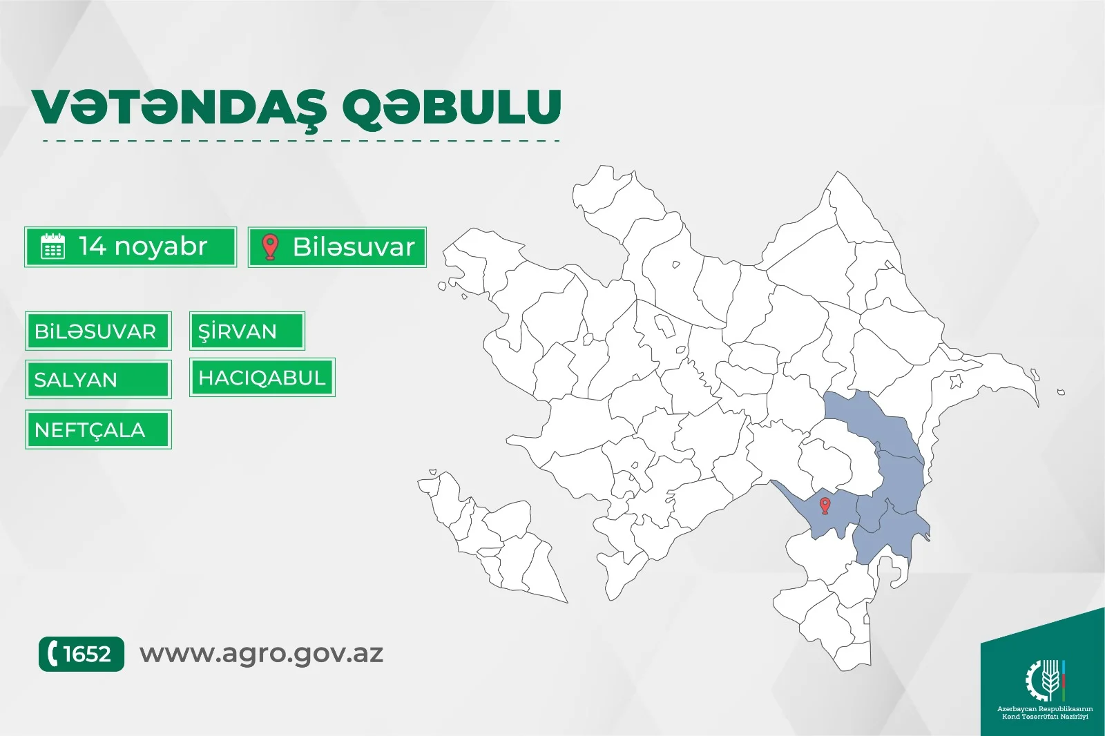 Azərbaycan Respublikasının kənd təsərrüfatı naziri Məcnun Məmmədov noyabrın 14-də saat 09:00-da Biləsuvar Dövlət Aqrar İnkişaf Mərkəzinin (DAİM) inzibati binasında Biləsuvar, Salyan, Neftçala, Şirvan və Hacıqabul rayonlarından olan vətəndaşları qəbul edəcək.