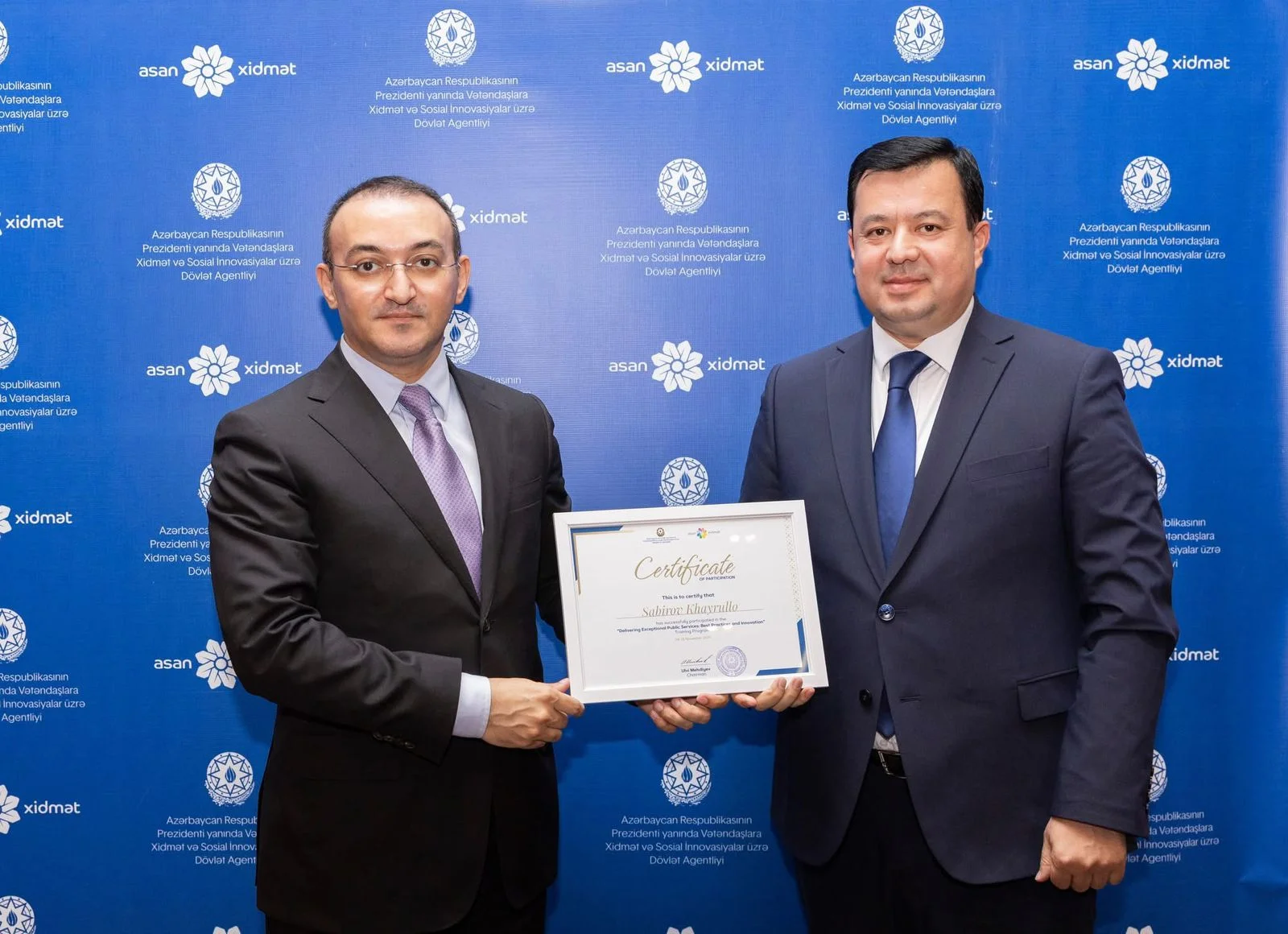 24-26 noyabr 2025-ci il tarixində “ASAN xidmət” təcrübəsi əsasında Özbəkistanda fəaliyyət göstərən Dövlət Xidmətləri Mərkəzlərinin nümayəndə heyəti ölkəmizdə səfərdə olub. Məqsəd Özbəkistan Respublikasının Ədliyyə Nazirliyinin rəsmi sorğusu əsasında Azərbaycan Respublikasının Prezidenti yanında Vətəndaşlara Xidmət və Sosial İnnovasiyalar üzrə Dövlət Agentliyi tərəfindən təşkil olunmuş təlim proqramında iştirak olub.