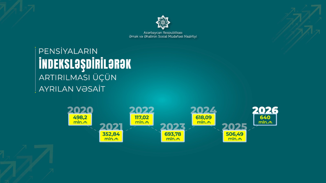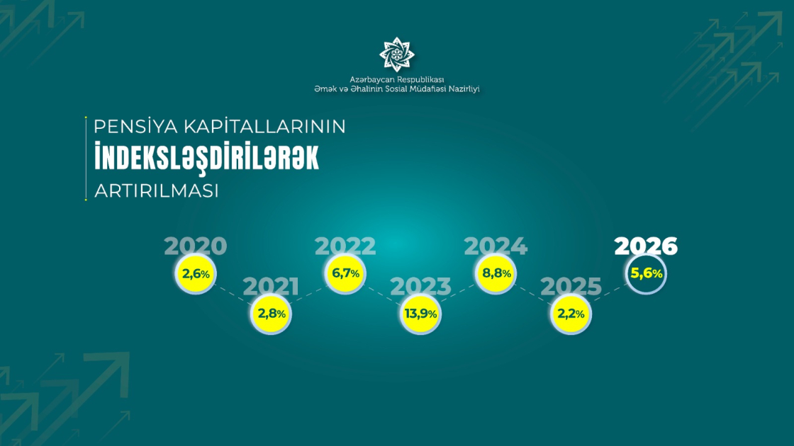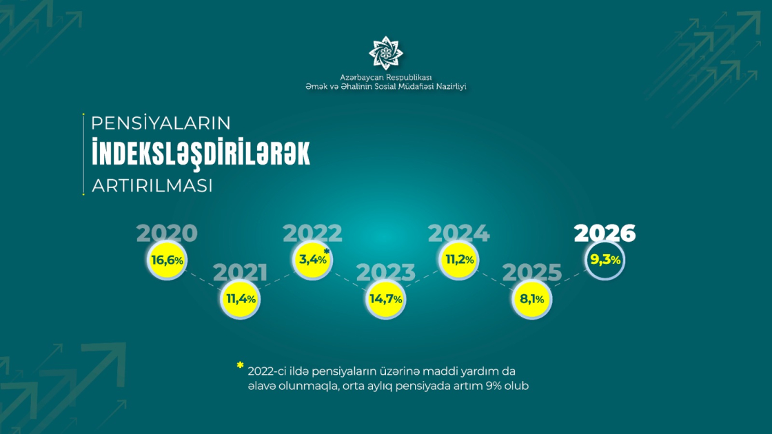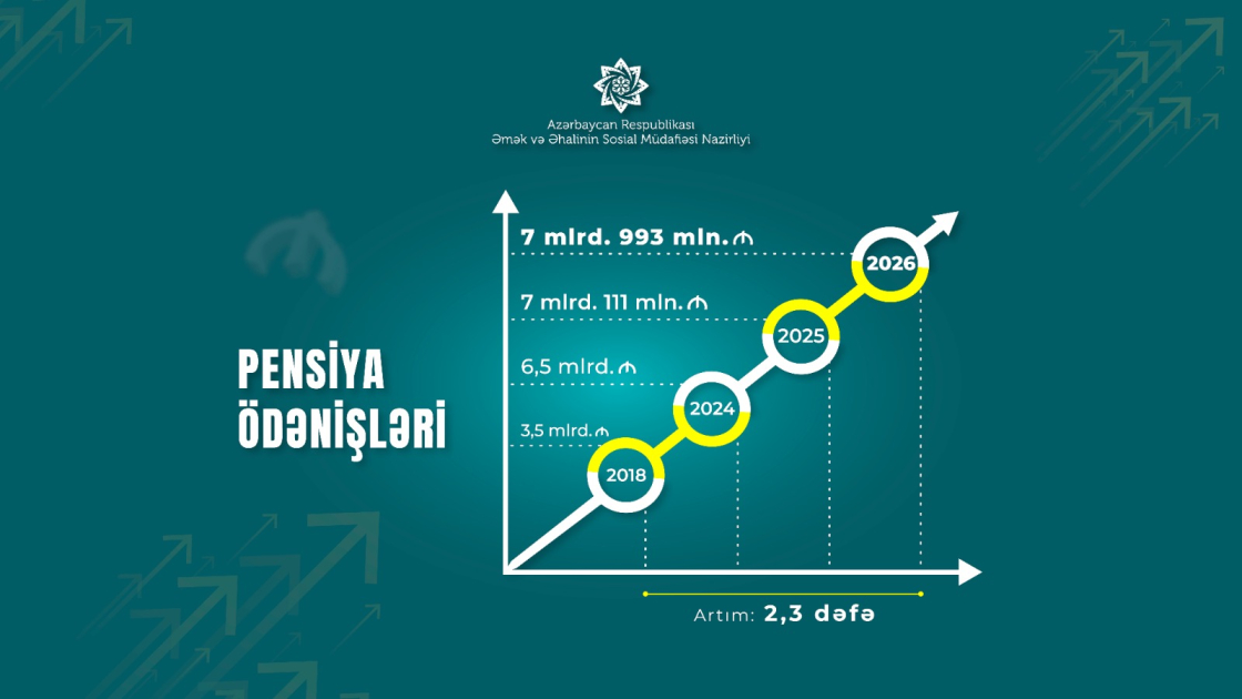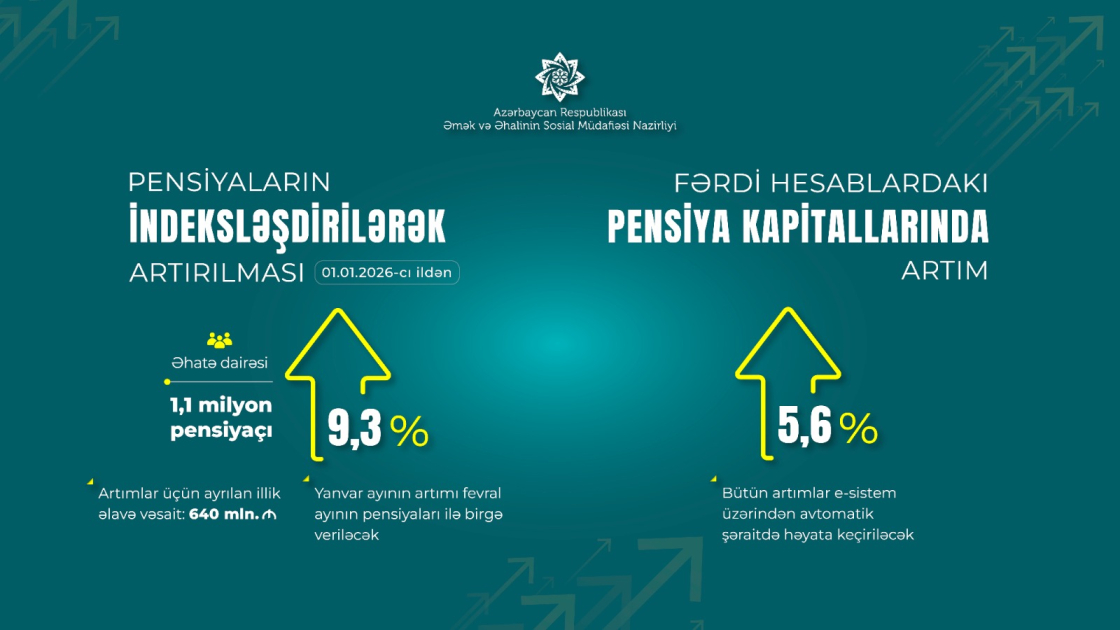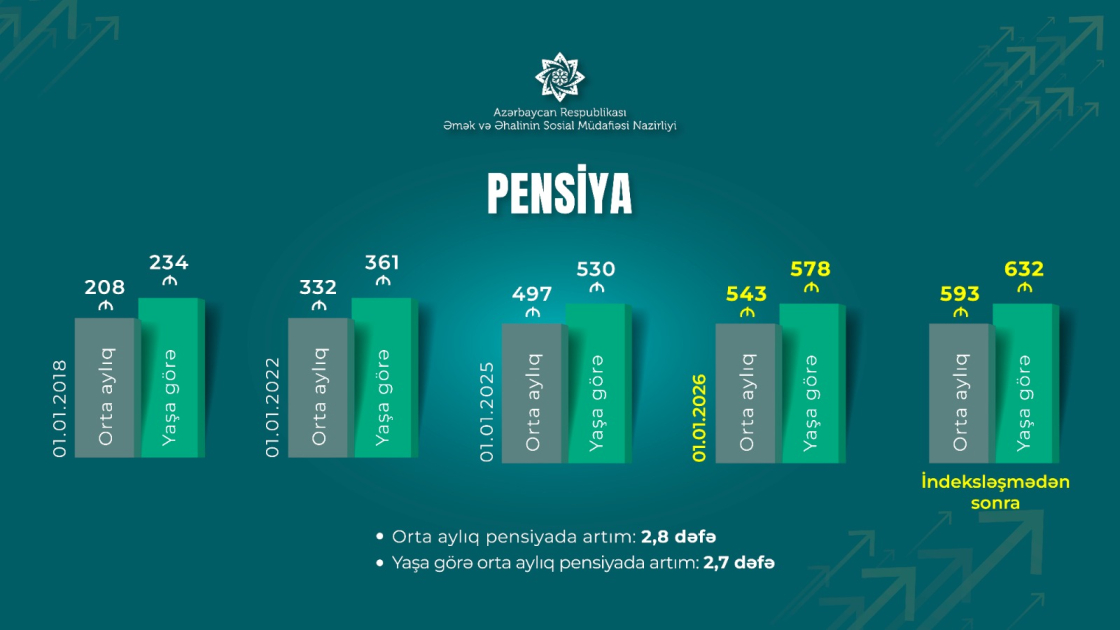 Bildirib ki, pensiyaların təyinatı kimi, pensiyalarda bu artım da proaktiv qaydada, pensiyaçıların müraciətinə və sənəd təqdim etmələrinə ehtiyac olmadan, e-sistem üzərindən avtomatik həyata keçirilir. Yeni pensiya artımları üçün illik əlavə olaraq 640 milyon manat vəsait ayrılıb. İndeksasiya üzrə yeni artım 2025-ci il üzrə inflyasiya dərəcəsini üstələyir: “2018-2025-ci illərdə orta aylıq pensiya 208 manatdan 543 manata, yaşa görə orta aylıq pensiya 234 manatdan 578 manata çatıbsa, artıq yeni artımla orta aylıq pensiya və yaşa görə orta aylıq pensiya müvafiq olaraq 593 manata və 632 manata çatır. Bu da 2018-ci ilə nisbətən orta aylıq pensiyada 2,8 dəfə, yaşa görə orta aylıq pensiyada 2,7 dəfə artıma nail olunması deməkdir.