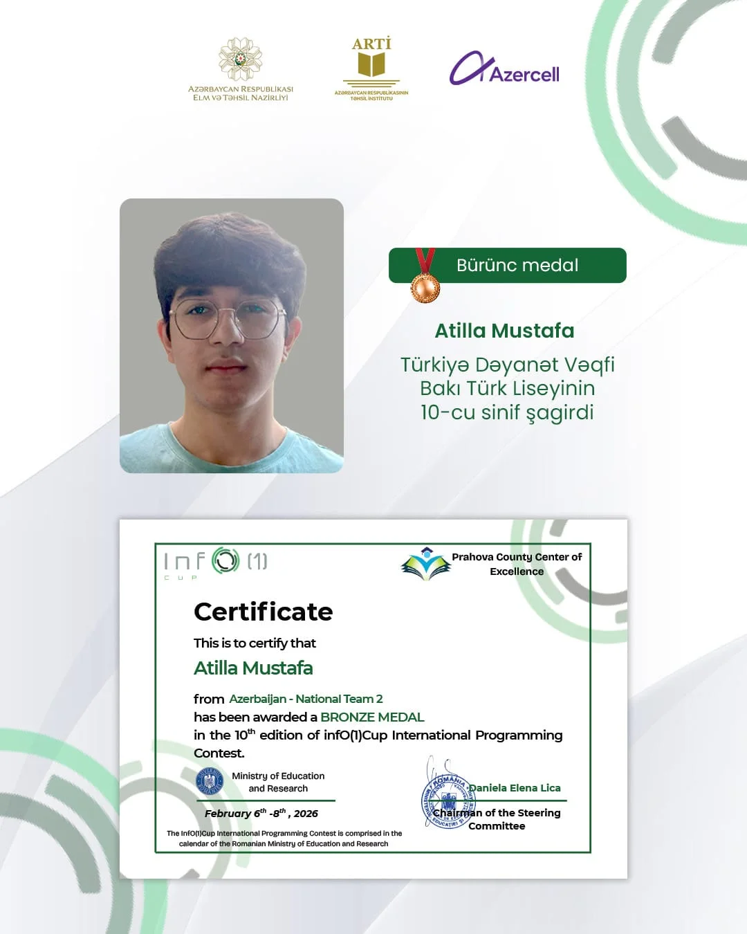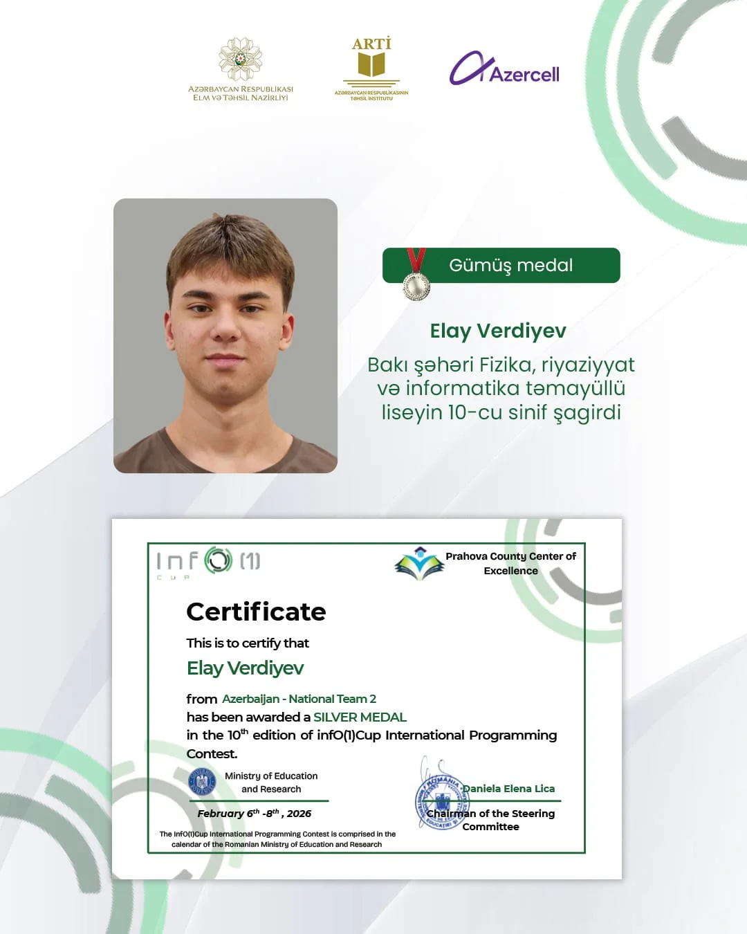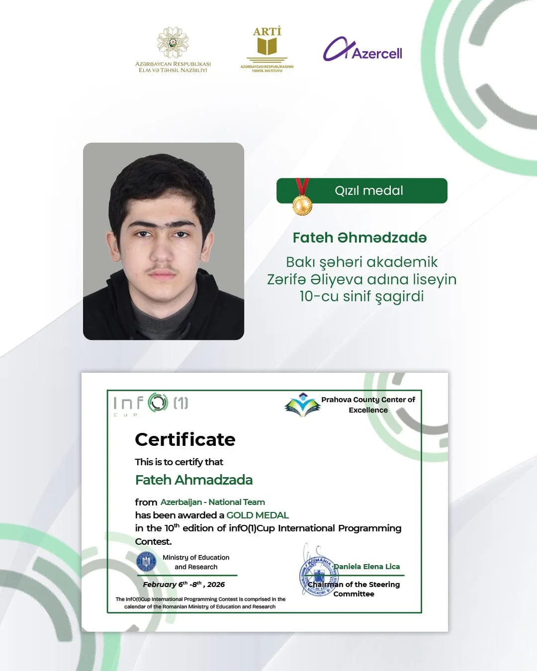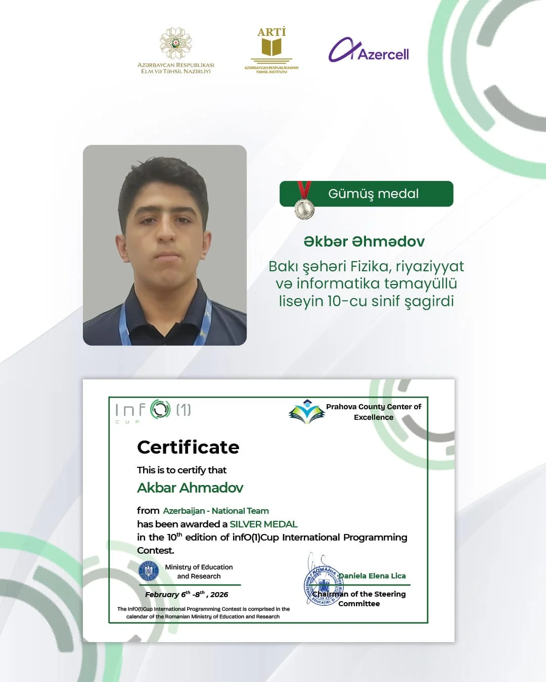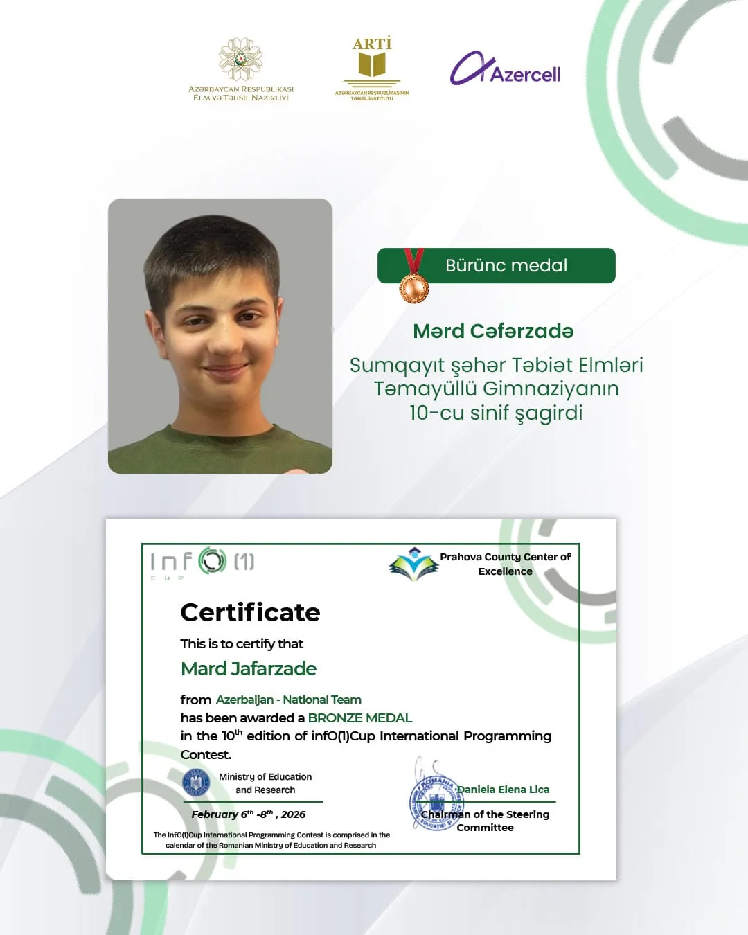 Fərqlənən istedadlarımızla tanış olaq: Bakı şəhəri akademik Zərifə Əliyeva adına liseyin 10-cu sinif şagirdi Fateh Əhmədzadə – qızıl medal, Türkiyə Dəyanət Vəqfi Bakı Türk Liseyinin 10-cu sinif şagirdi Ömər Əliməmmədzadə – gümüş medal, Bakı şəhəri Fizika, riyaziyyat və informatika təmayüllü liseyin 10-cu sinif şagirdləri Elay Verdiyev və Əkbər Əhmədov – gümüş medal, Türkiyə Dəyanət Vəqfi Bakı Türk Liseyinin 10-cu sinif şagirdi Atilla Mustafa və Sumqayıt şəhər Təbiət Elmləri Təmayüllü Gimnaziyanın 10-cu sinif şagirdi Mərd Cəfərzadə – bürünc medal.
