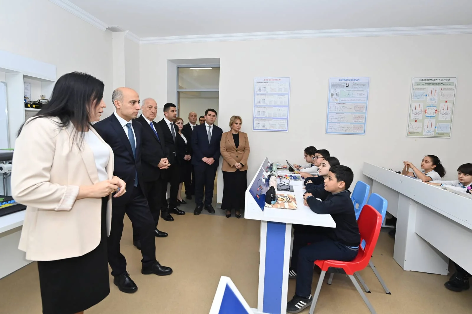 Sinif otaqlarına baxış zamanı nazir STEAM və “Rəqəmsal bacarıqlar” layihələrinin tədris prosesi ilə yaxından maraqlanıb, dərslərin təşkilini izləyib və şagirdlərlə fikir mübadiləsi aparıb. Şagirdlərin təqdim etdikləri layihə və praktiki işlərlə tanış olan nazir sözügedən layihələrin əhatə dairəsinin genişləndirilməsinin vacibliyini vurğulayıb.