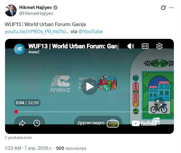 Azərbaycan Prezidentinin köməkçisi - Prezident Administrasiyasının (PA) xarici siyasət məsələləri şöbəsinin müdiri Hikmət Hacıyev "X"dəki hesabında Ümumdünya Şəhərsalma Forumu (WUF13) çərçivəsində "AnewZ" telekanalının Gəncə haqqında hazırlanmış süjetini paylaşıb.
