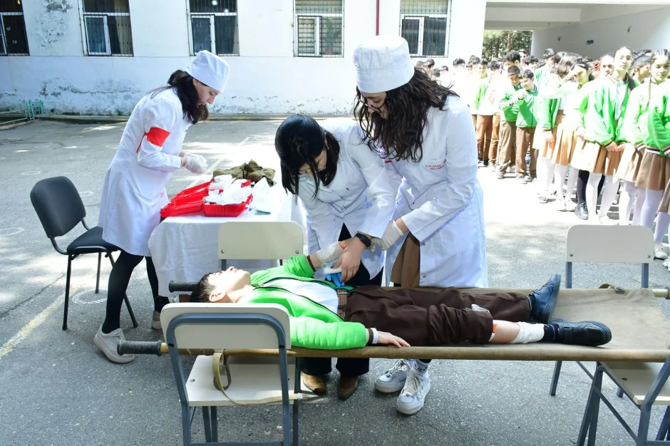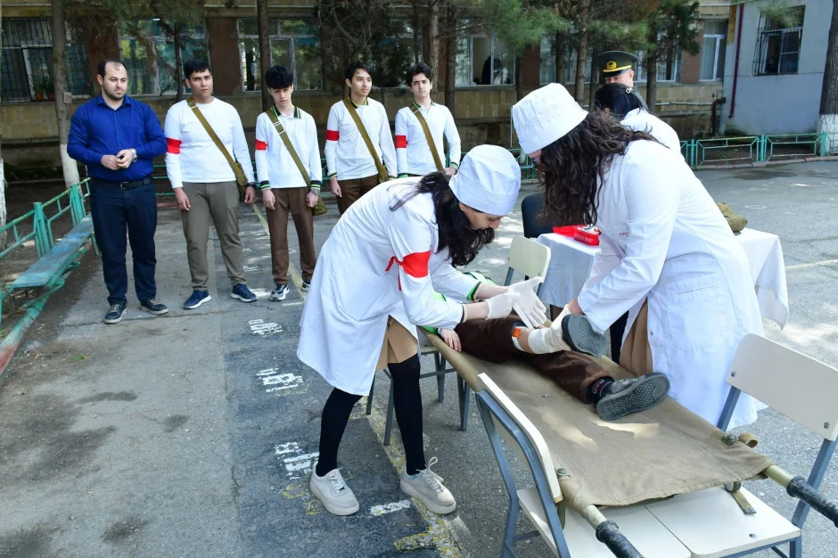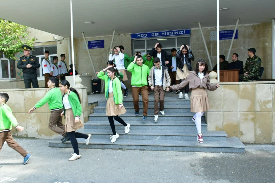 Praktiki hissədə baş vermiş şərti fövqəladə hadisə ilə əlaqədar məktəb kollektivinin təxliyəsi, “zərərçəkmişlərə ilkin yardımın göstərilməsi” və digər əməliyyatlar icra olunub.