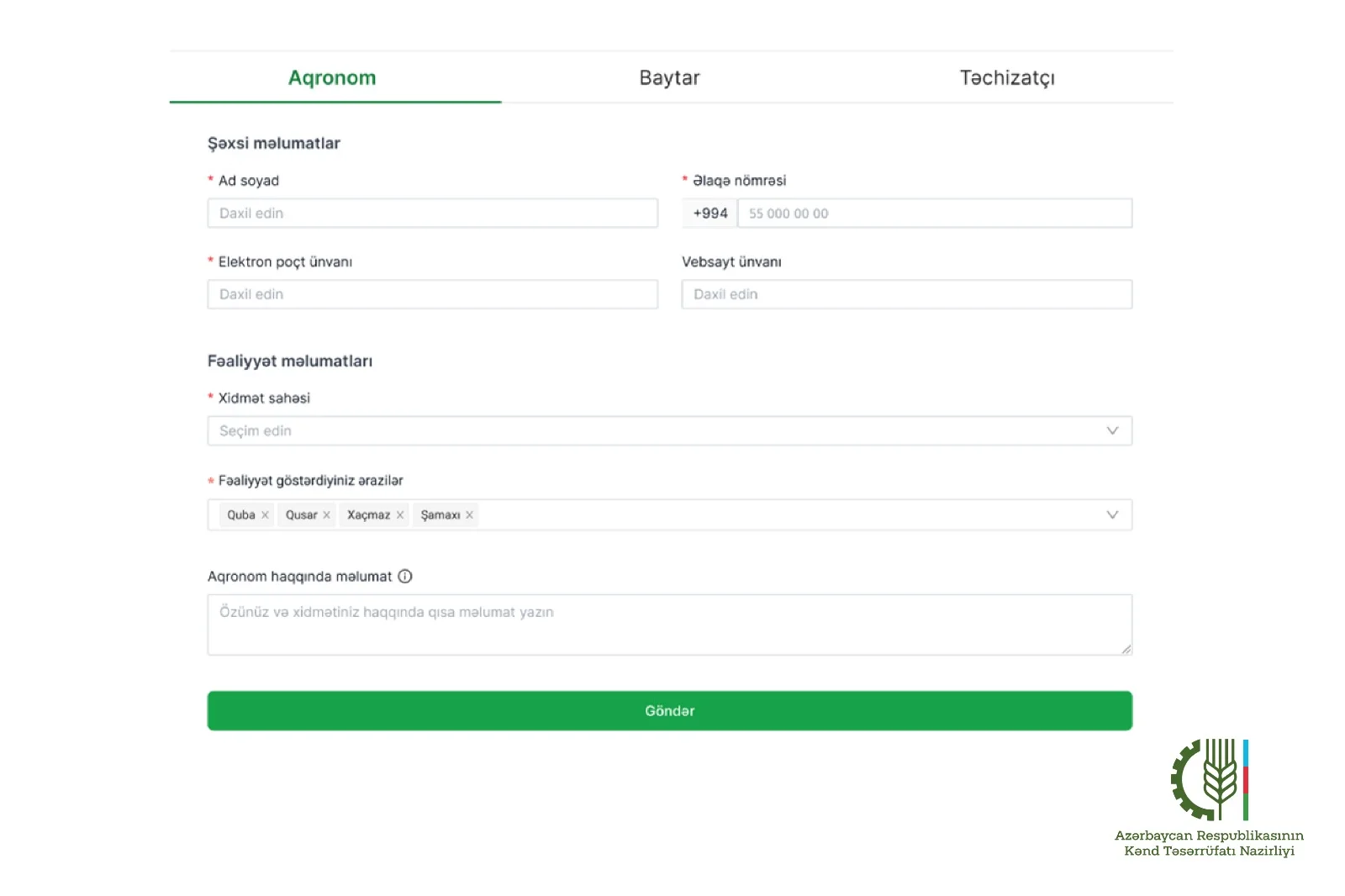 Azturkxeber.az-a verilən məlumata görə, bunun üçün www.tapagro.az portalına daxil olaraq Bizə qoşul bölməsinə keçid etmək, göstərilən xidmətlərə dair ilkin məlumatları sistemə daxil etmək kifayətdir.