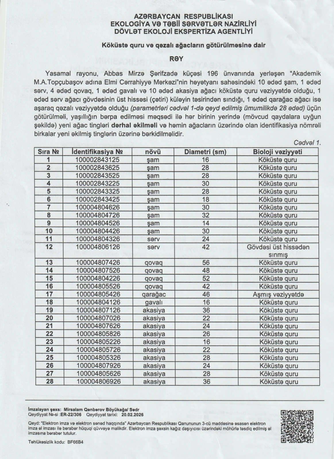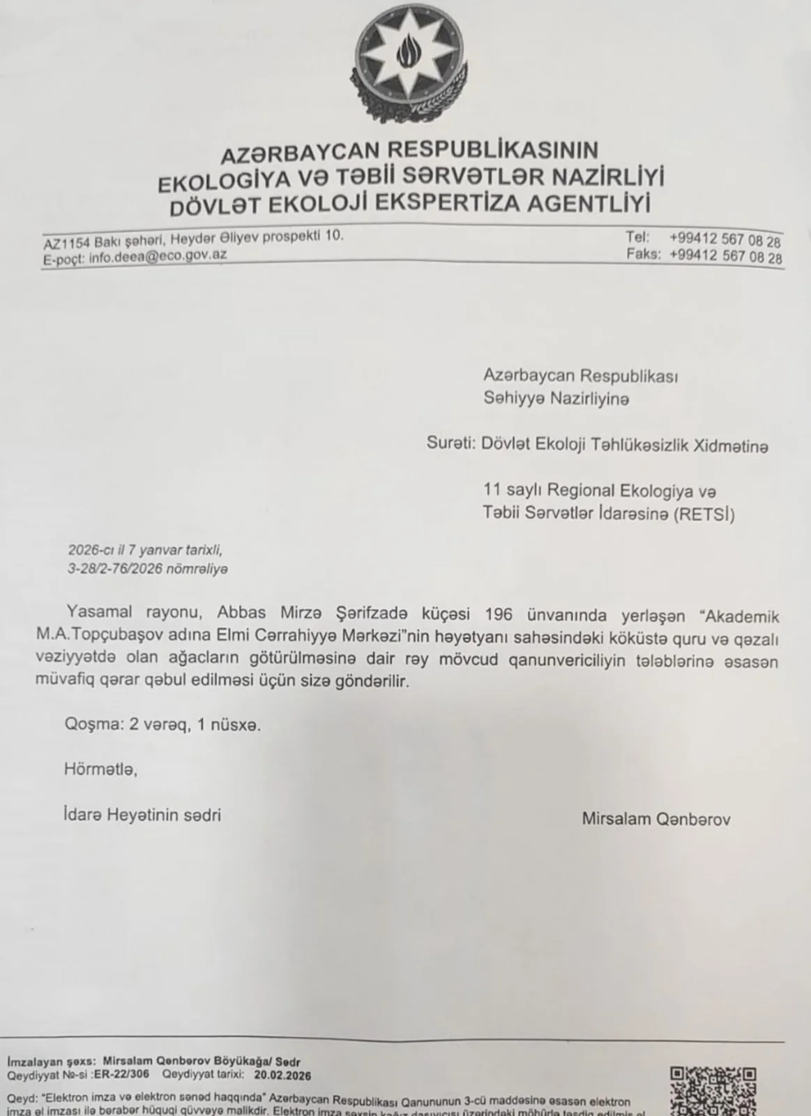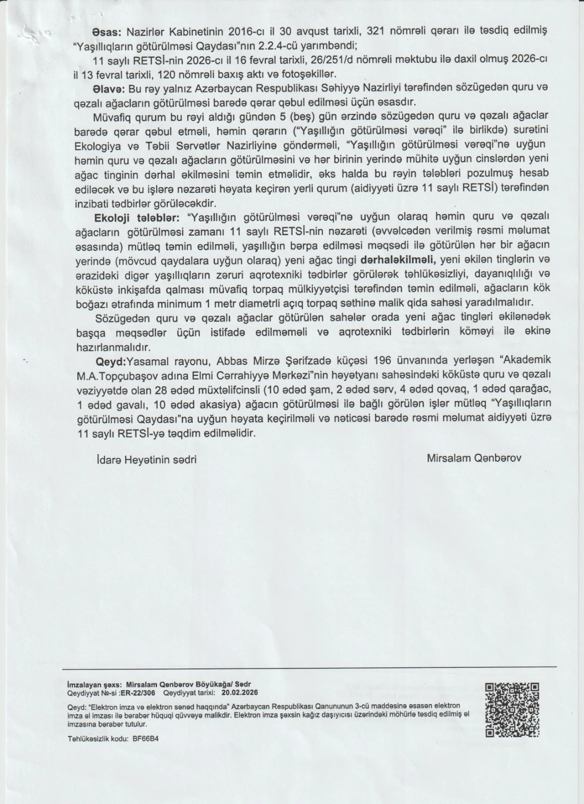 Ağacların götürülməsi Ekologiya və Təbii Sərvətlər Nazirliyinin Dövlət Ekoloji Ekspertiza Agentliyi tərəfindən verilmiş rəy və müvafiq komissiya qərarları əsasında aparılıb. Bu barədə rəy, protokollar, yaşıllıqların götürülməsi üzrə komissiyanın qərarı və foto materiallar mövcuddur.