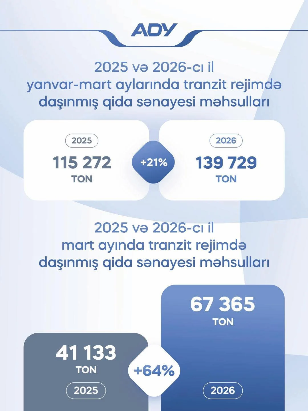 Qida sənayesi məhsullarının tranzit daşımalarında da artım müşahidə olunub. Belə ki, cari ilin birinci rübündə tranzit daşımalar 21% artaraq 139,7 min ton, mart ayında isə 64% artaraq 67,3 min ton təşkil edib.
