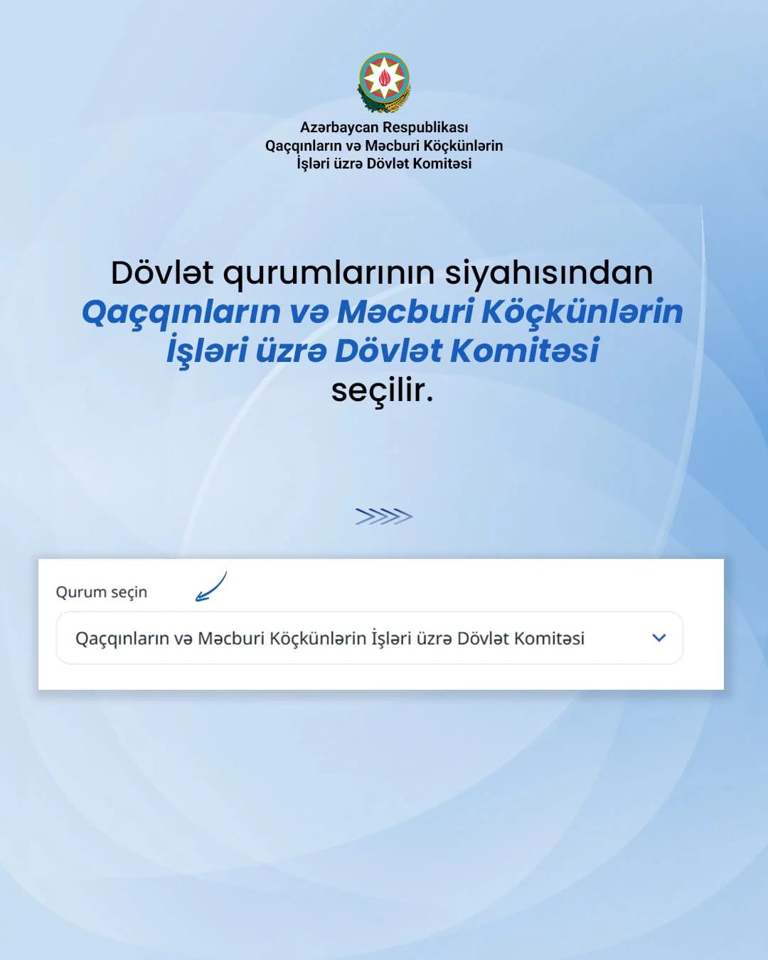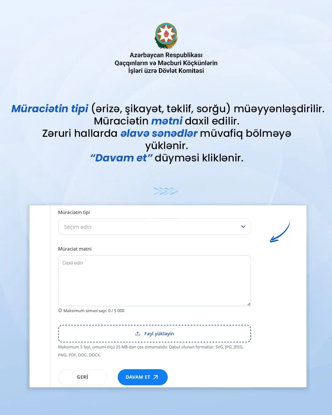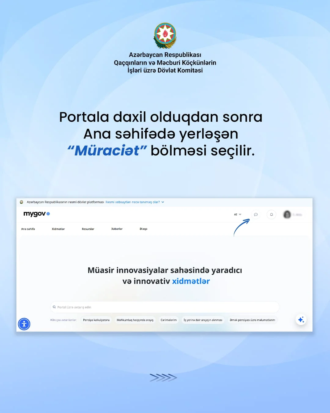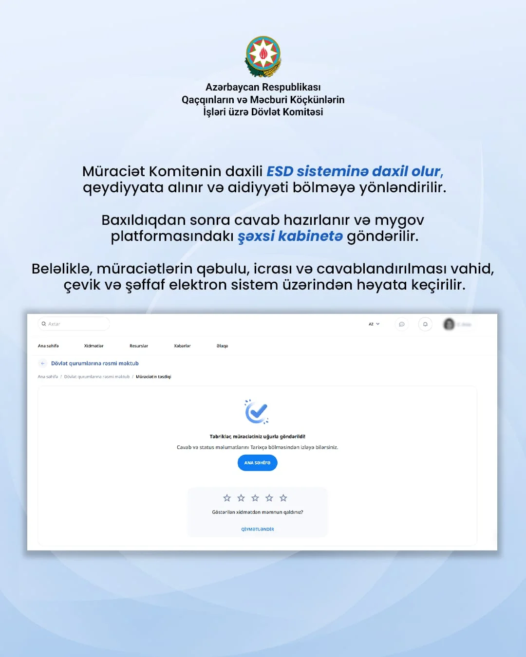 Portala daxil olduqdan sonra Ana səhifədə yerləşən müraciət bölməsindən “Dövlət qurumlarına müraciət” seçilir. Açılan bölmədə “Müraciət et” düyməsi klik edilir. Dövlət qurumlarının siyahısından Qaçqınların və Məcburi Köçkünlərin İşləri üzrə Dövlət Komitəsi seçilir, “müraciətin tipi” - ərizə, şikayət, təklif, sorğu - müəyyənləşdirilir. Daha sonra müraciət mətni daxil edilir. Müraciətə əlavə edilməsi istənilən digər sənədlərin zəruri bölməyə yükləndikdən sonra “Davam et” düyməsi seçilir. Bu zaman vətəndaşın fərdi elektron poçt ünvanı və əlaqə nömrəsi qeyd edilir.