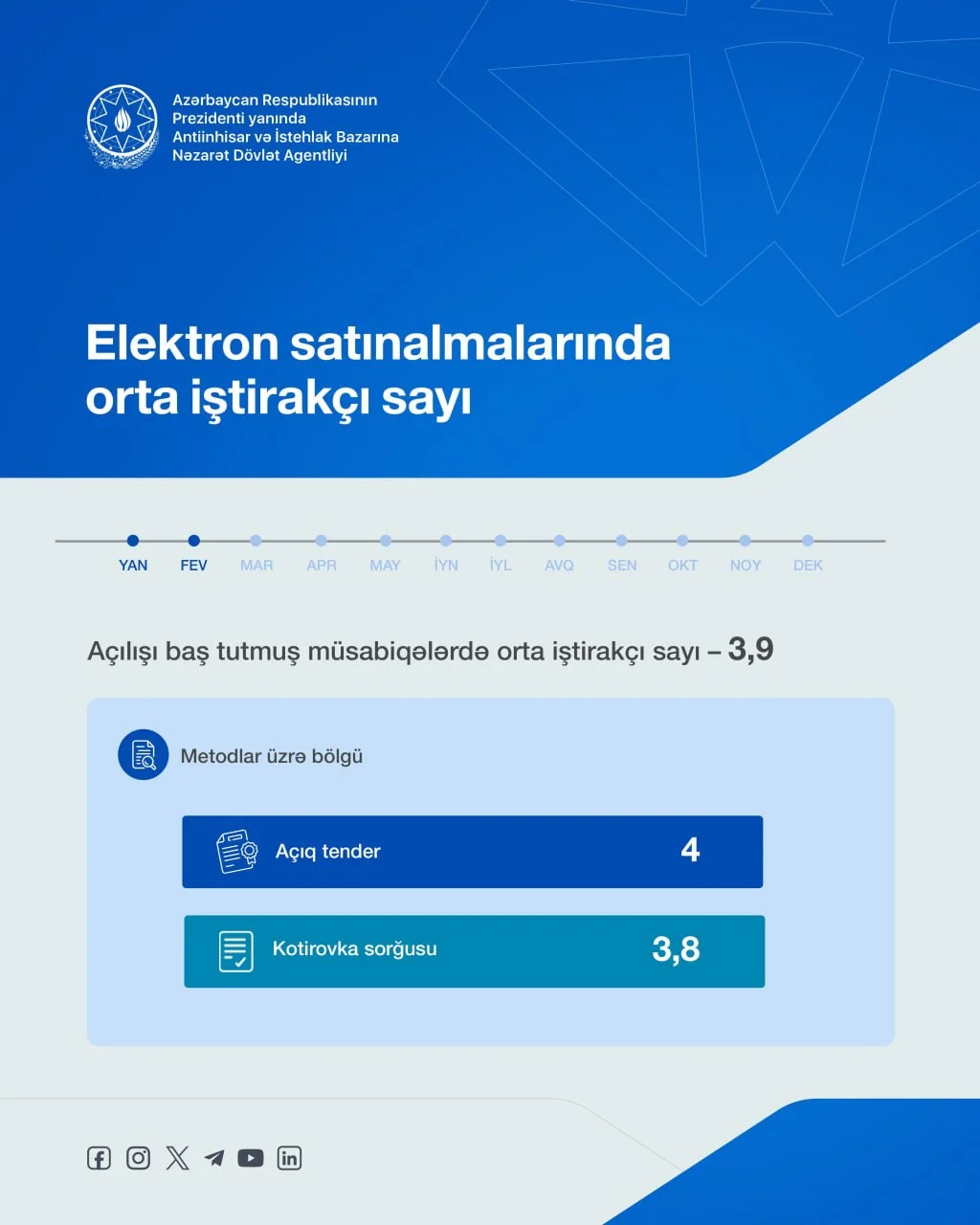Hesabat dövründə açılışı baş tutan müsabiqələr üzrə orta iştirakçı sayı 3,9 olub. Bu, sağlam rəqabətin, KOB-ların fəallığının və iqtisadi diversifikasiyanın göstəricisidir.